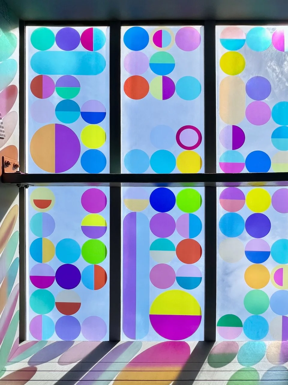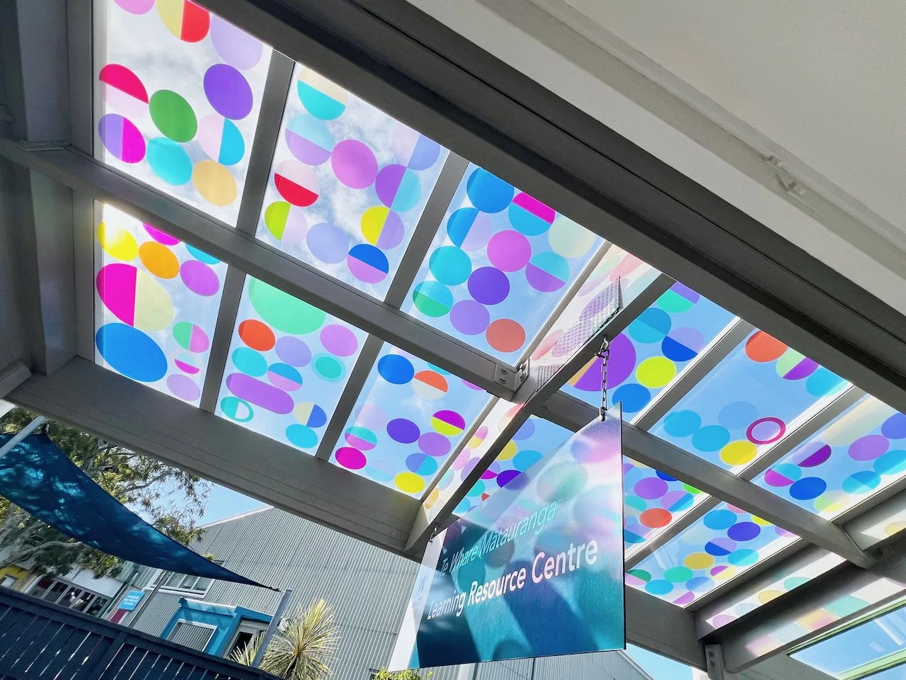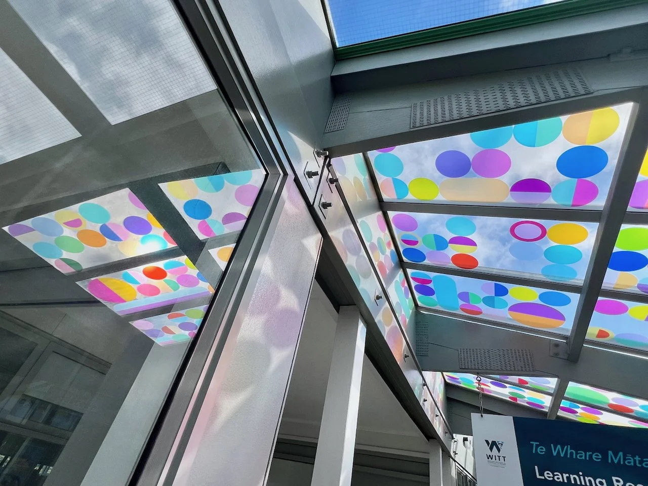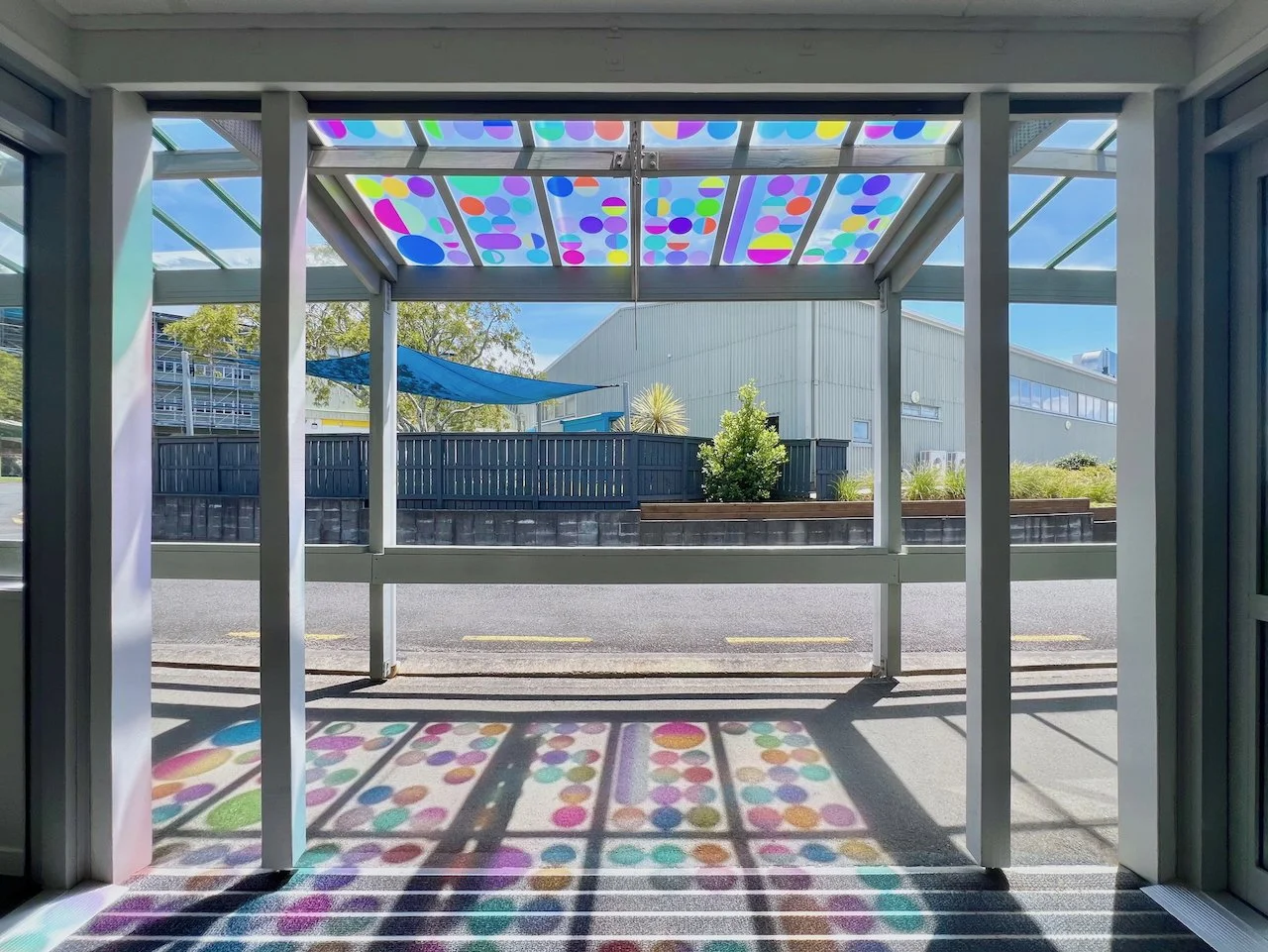 “The Taranaki region extends 12 nautical miles offshore, underwater. This submerged land echoes marginalised communities in Taranaki that are often hidden and silenced, yet they remain an important, integral, and valuable part of the region. 12 Nautical Miles acknowledges and celebrates these communities through 12 glass panes looking skyward toward infinite possibilities”.