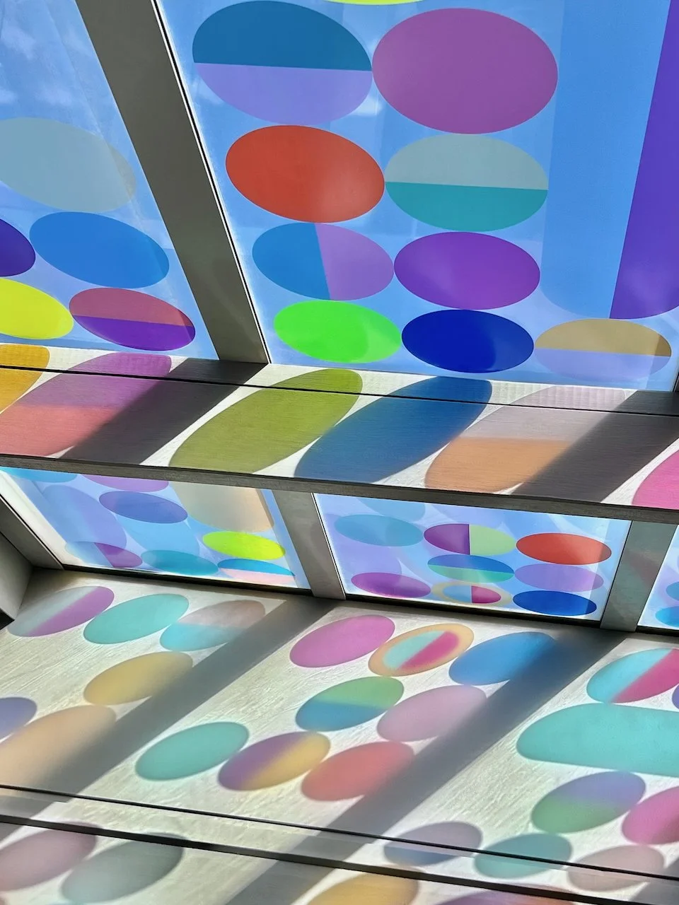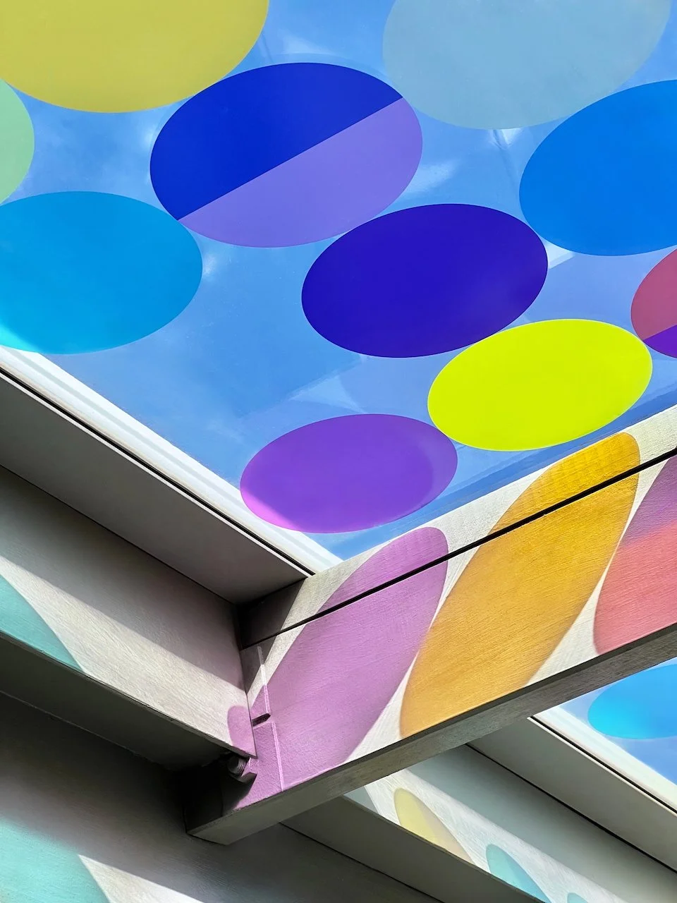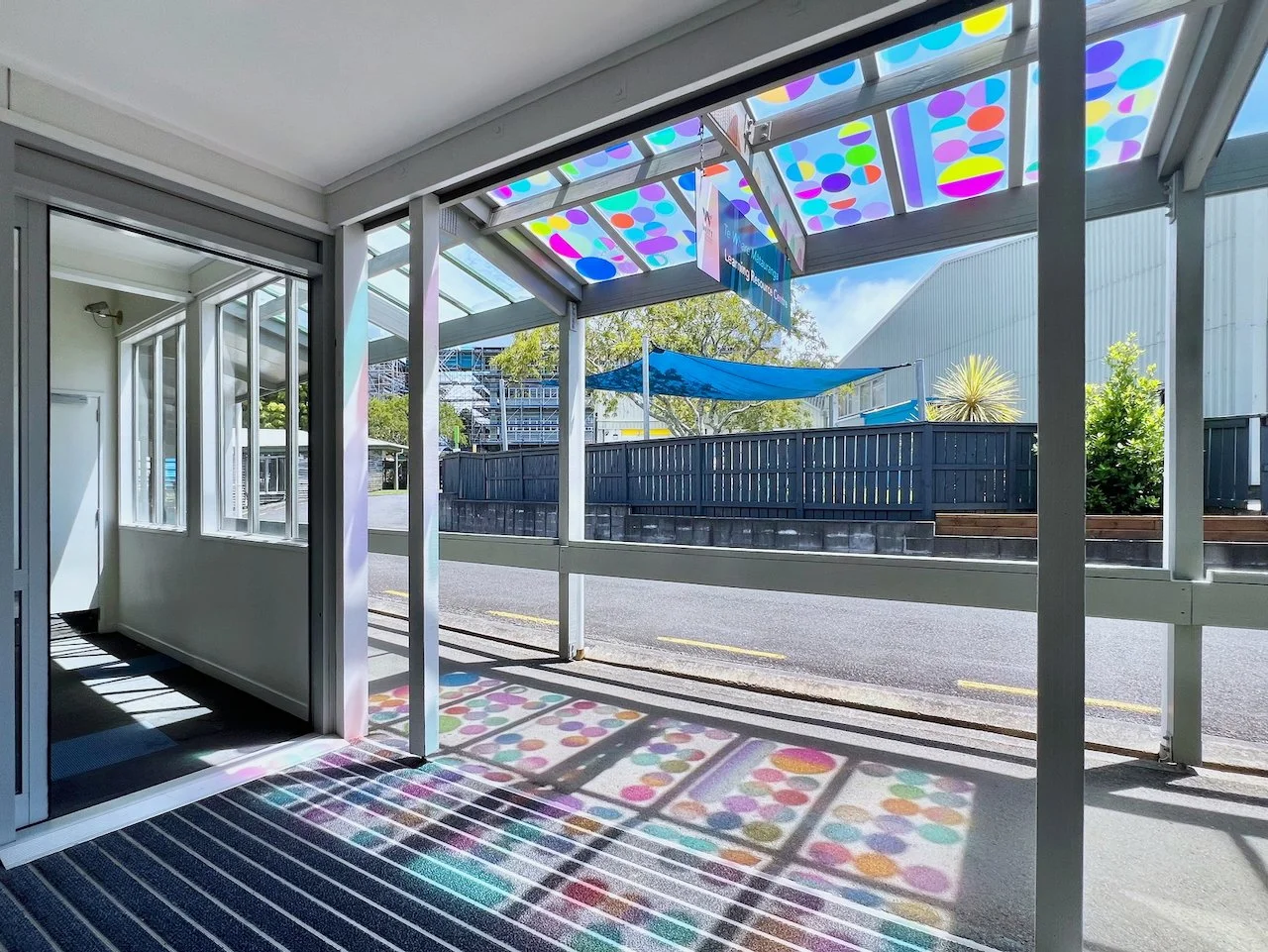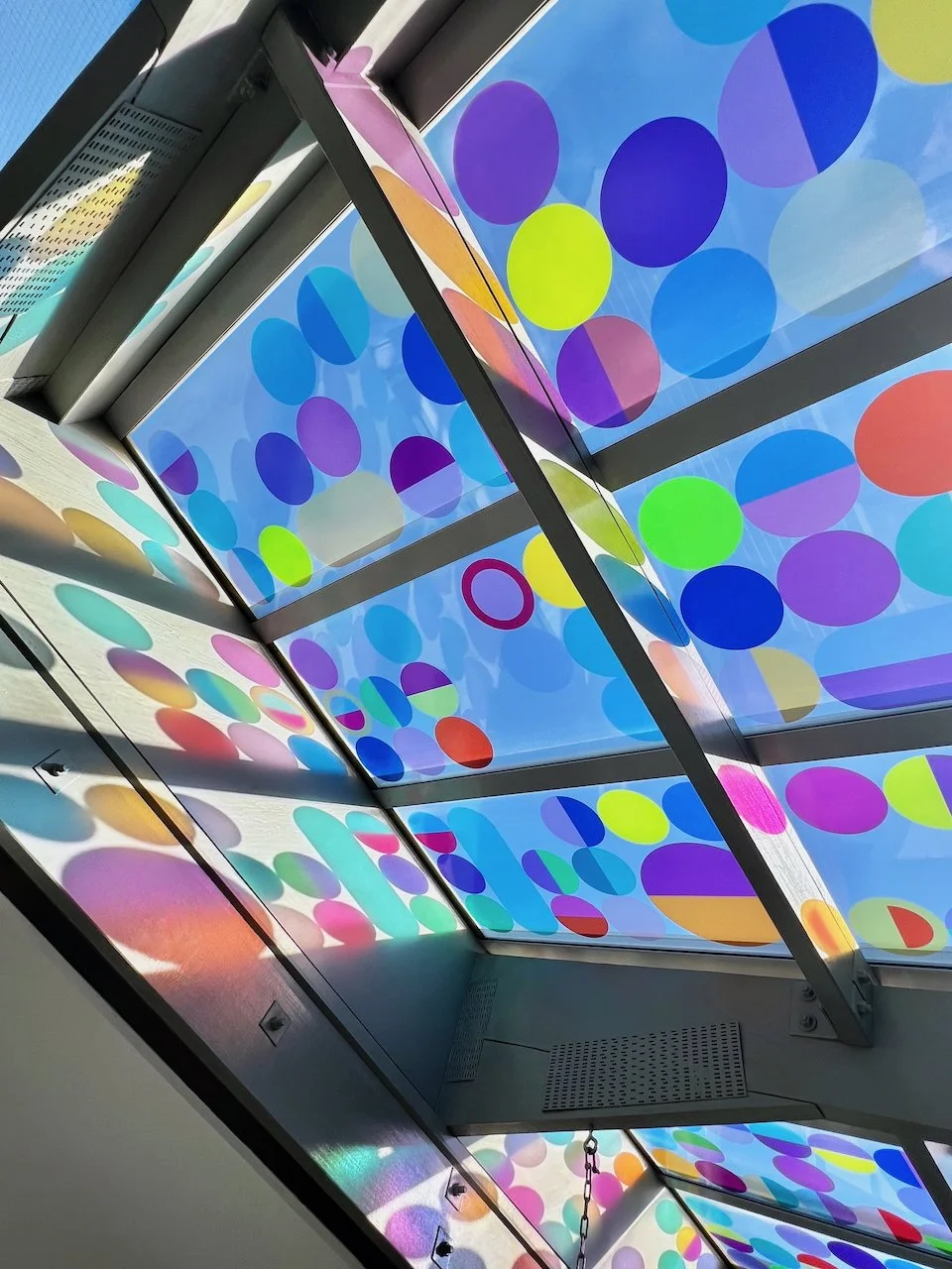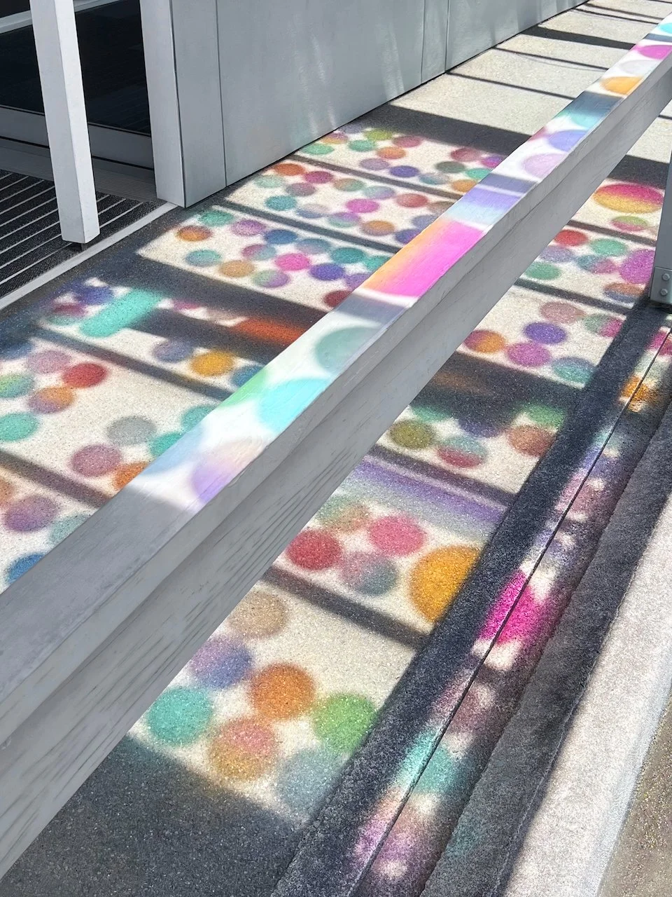 “The Taranaki region extends 12 nautical miles offshore, underwater. This submerged land echoes marginalised communities in Taranaki that are often hidden and silenced, yet they remain an important, integral, and valuable part of the region. 12 Nautical Miles acknowledges and celebrates these communities through 12 glass panes looking skyward toward infinite possibilities”.