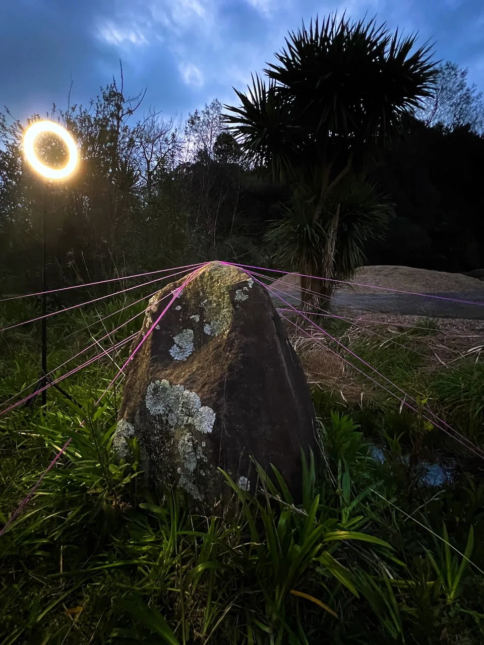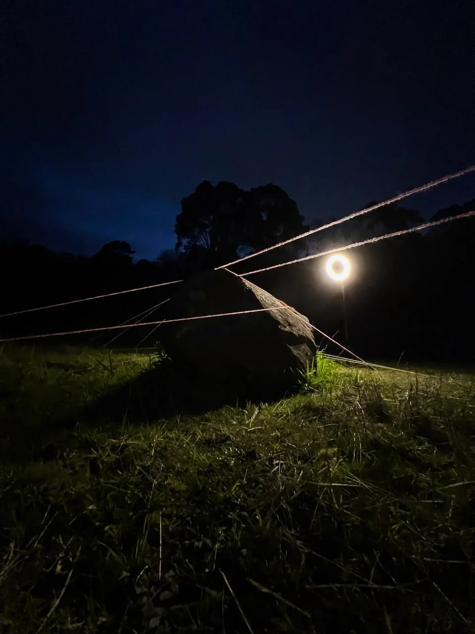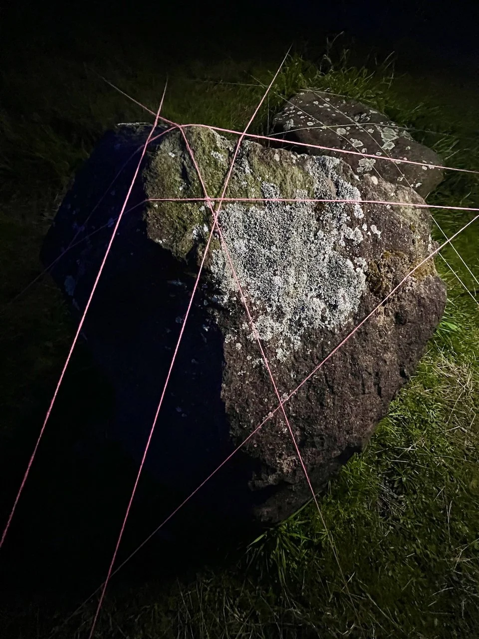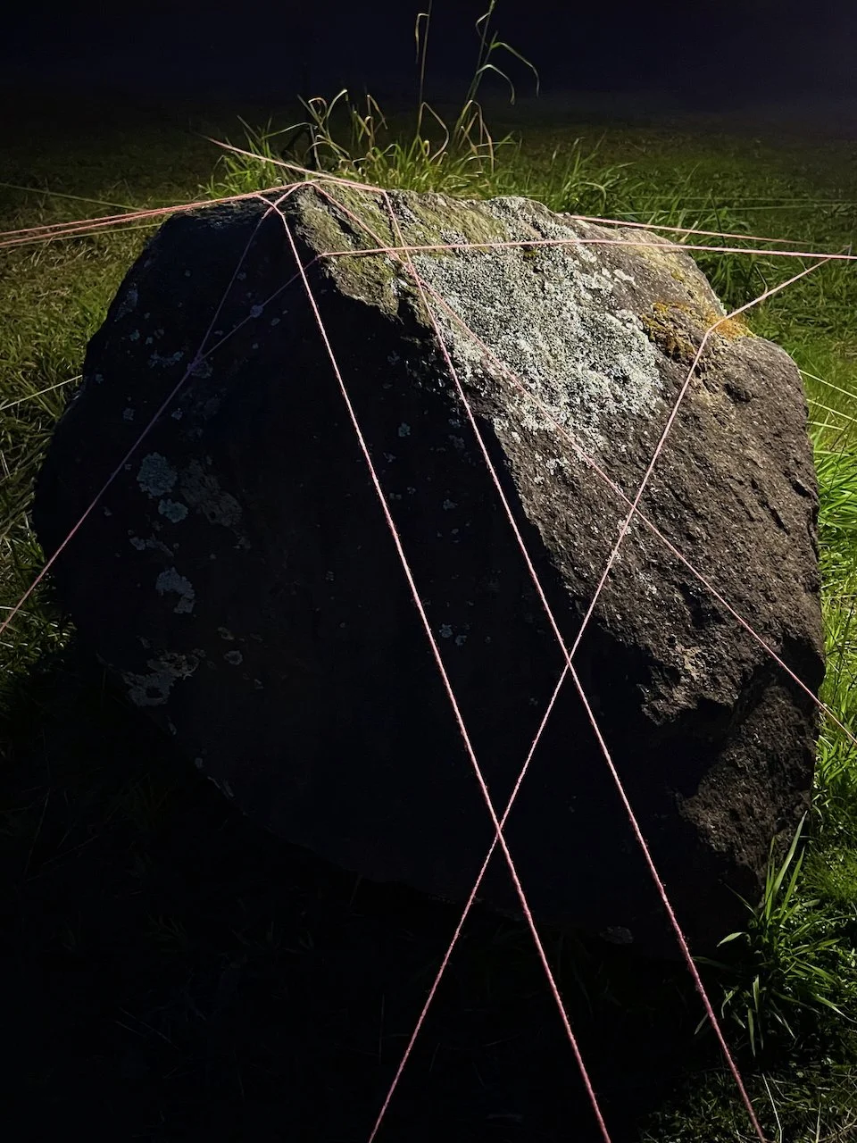 Each stone is protected by a web of coloured yarn pinned to the surrounding soil with steel tent pegs. This references the rug making, weaving, and tapestry prisoners could engage in to help grow and maintain positive mental health outcomes. The work is lit with LED’s during the night.