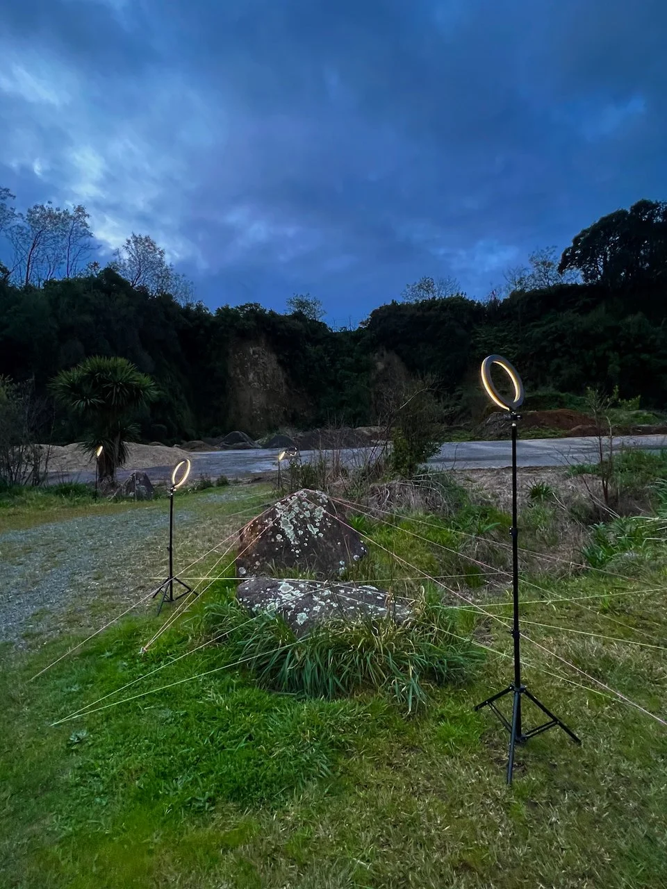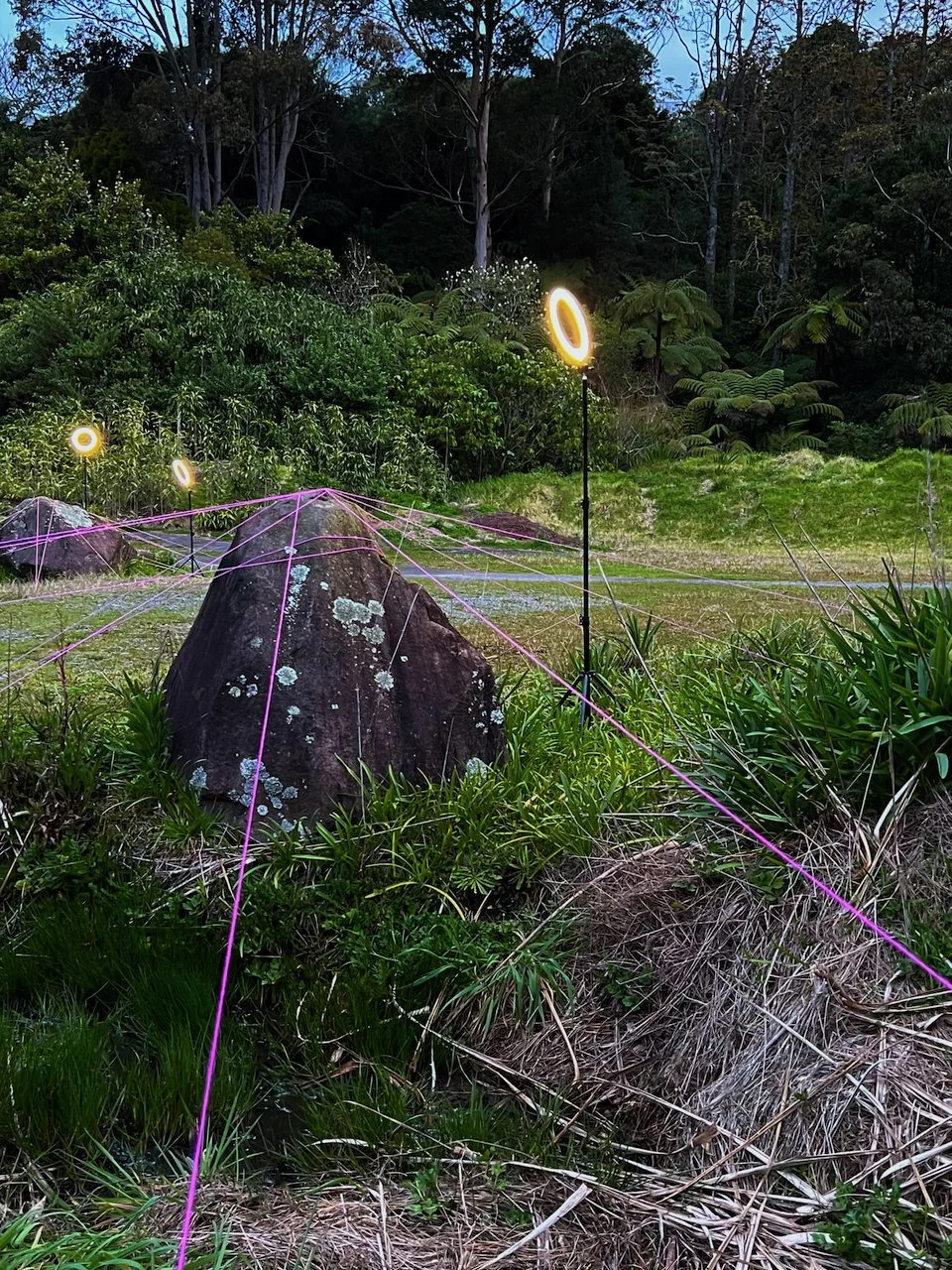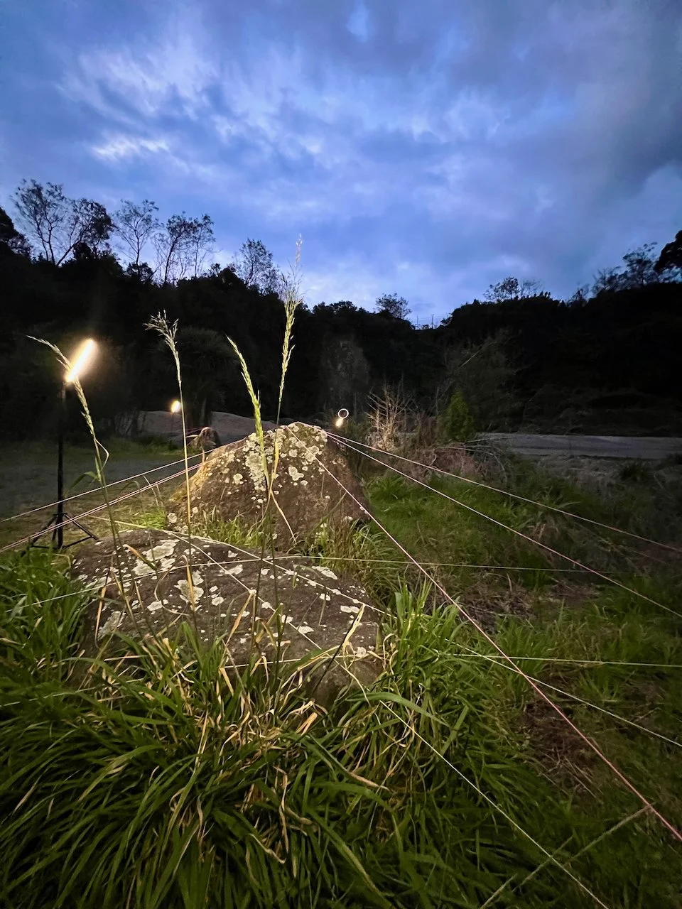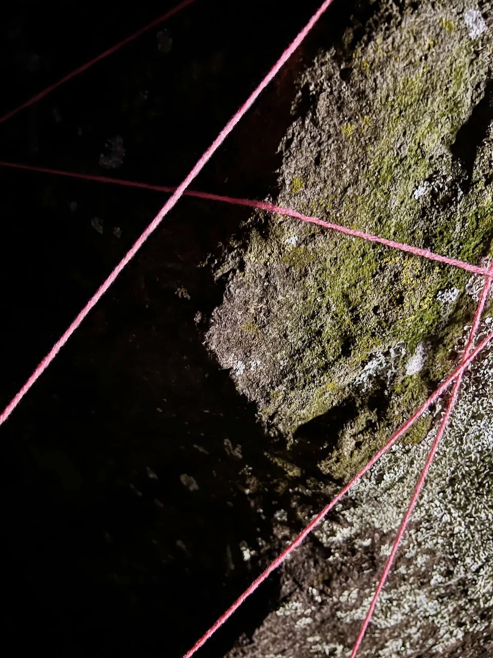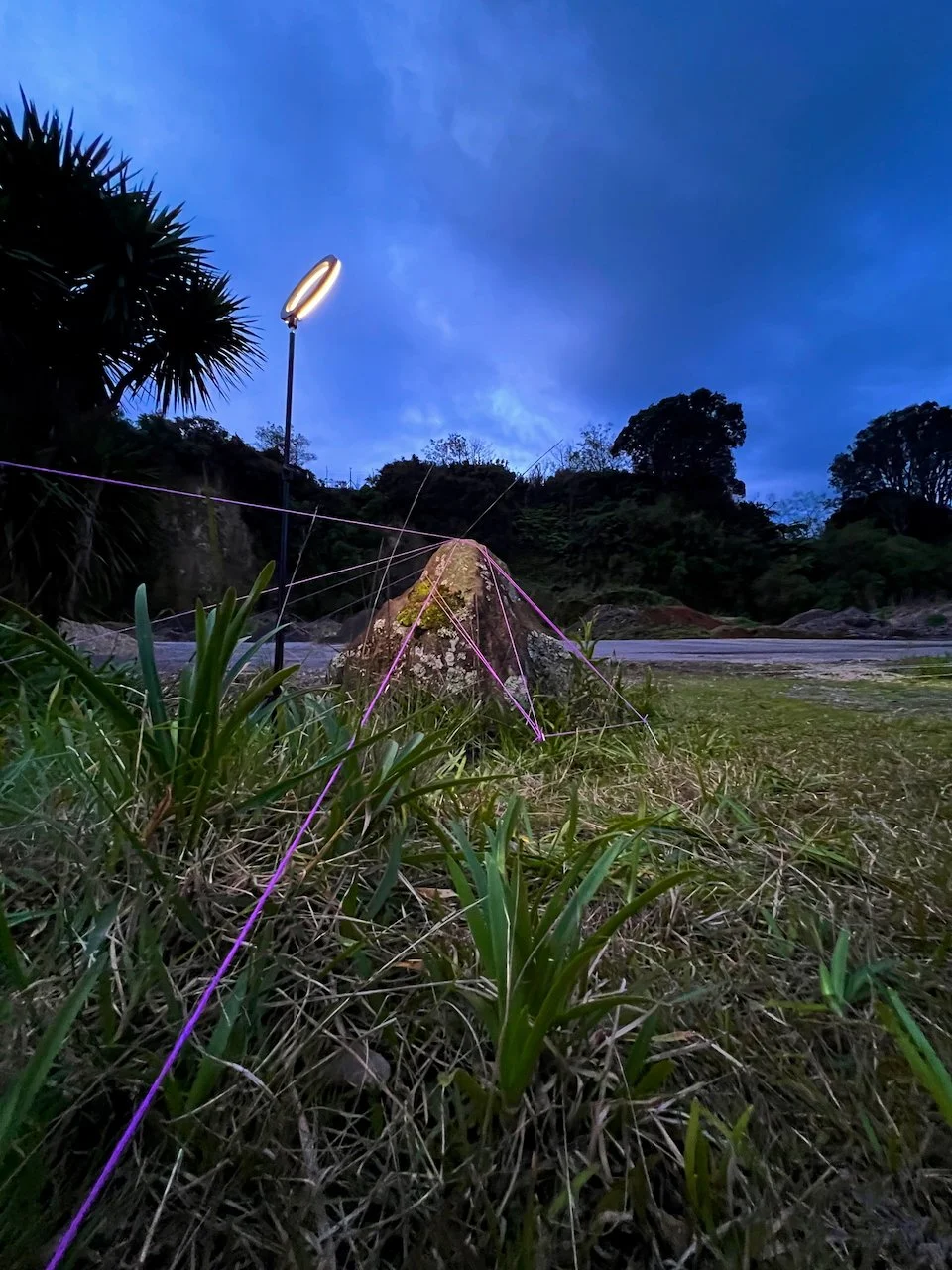 Each stone is protected by a web of coloured yarn pinned to the surrounding soil with steel tent pegs. This references the rug making, weaving, and tapestry prisoners could engage in to help grow and maintain positive mental health outcomes. The work is lit with LED’s during the night.