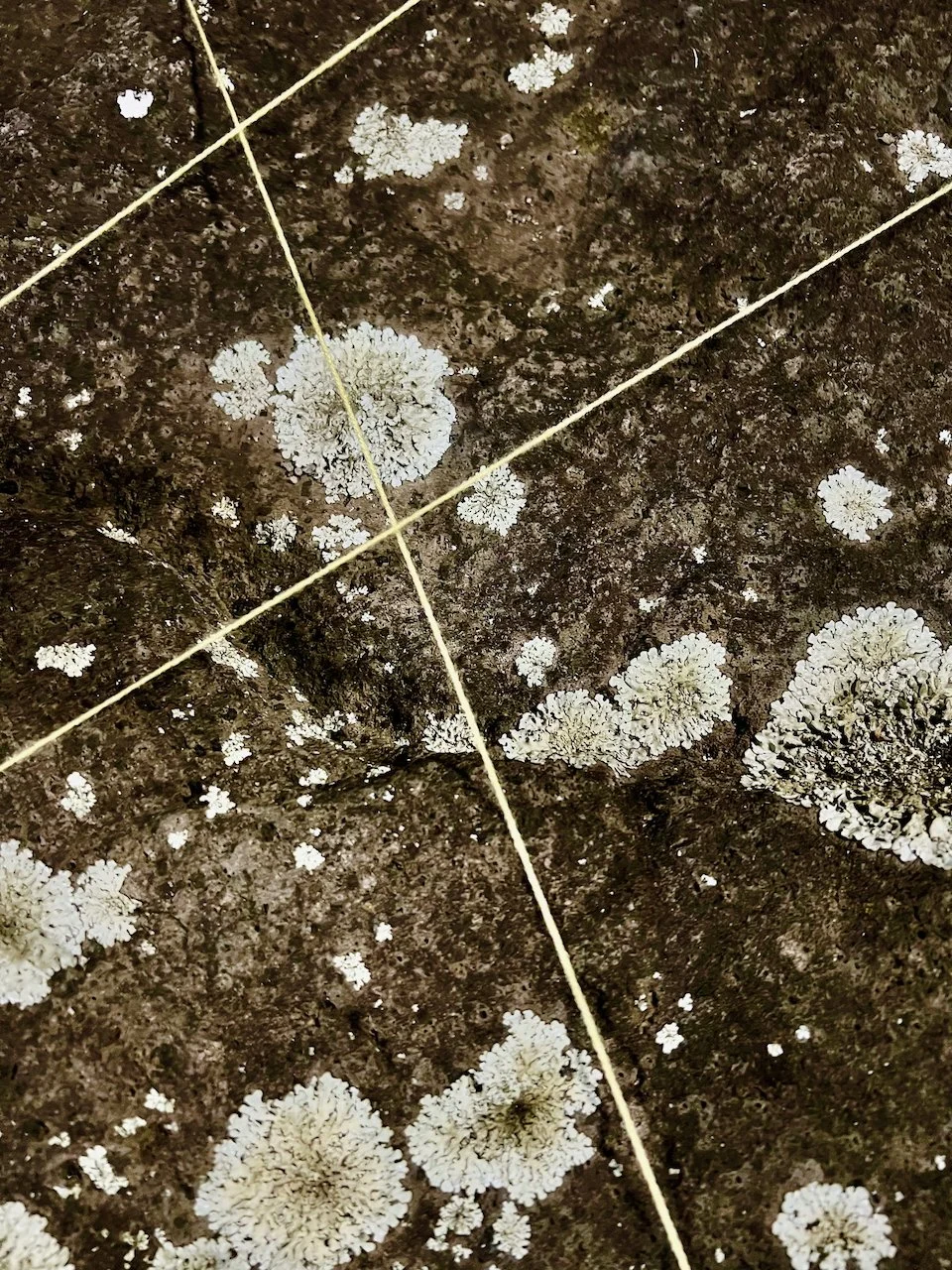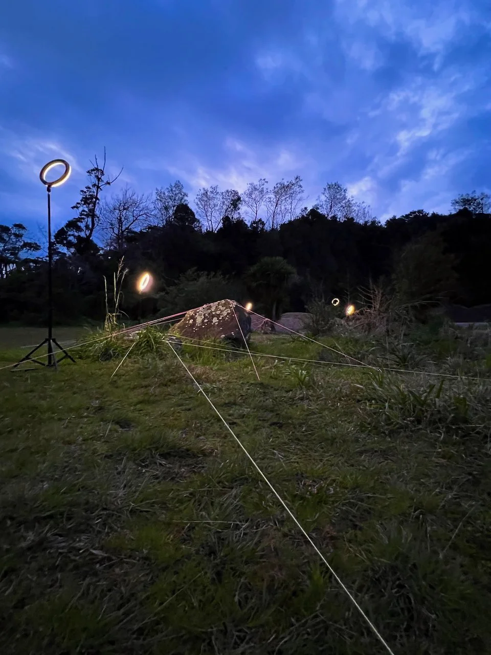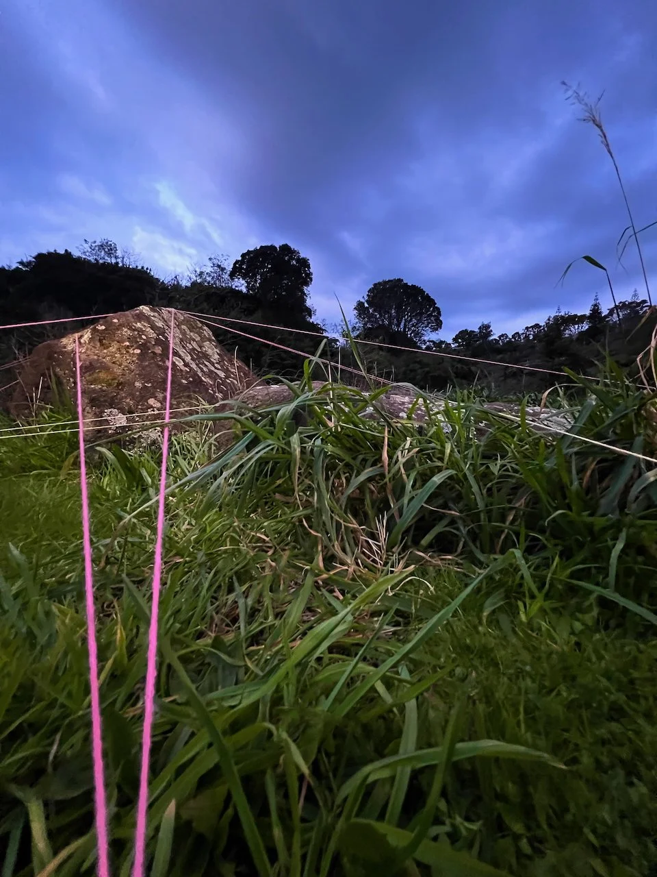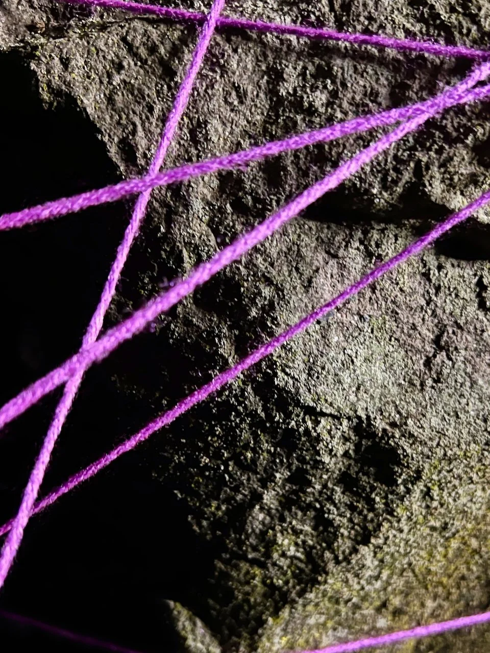Each stone is protected by a web of coloured yarn pinned to the surrounding soil with steel tent pegs. This references the rug making, weaving, and tapestry prisoners could engage in to help grow and maintain positive mental health outcomes. The work is lit with LED’s during the night.