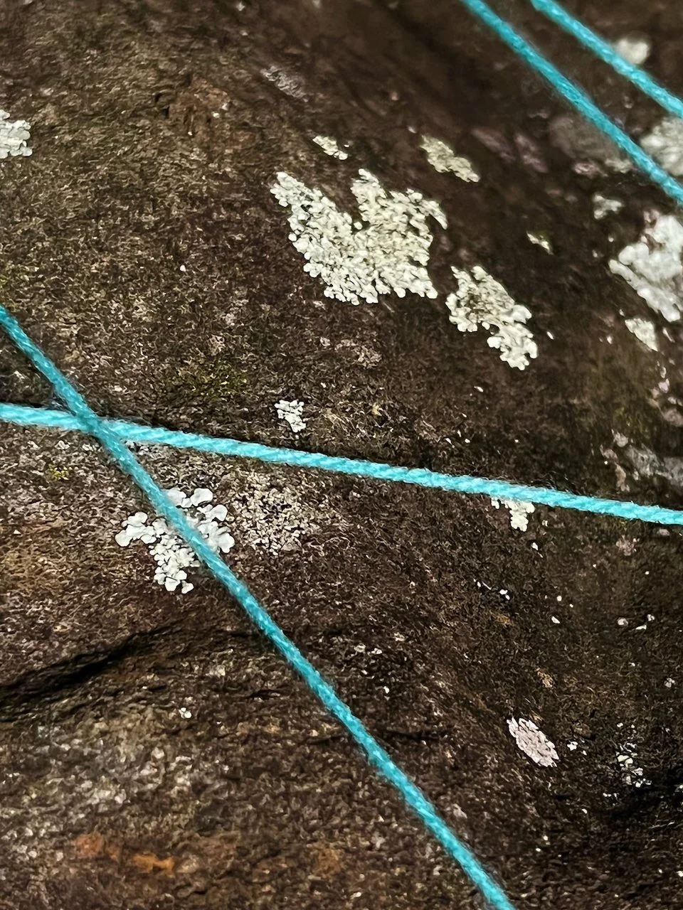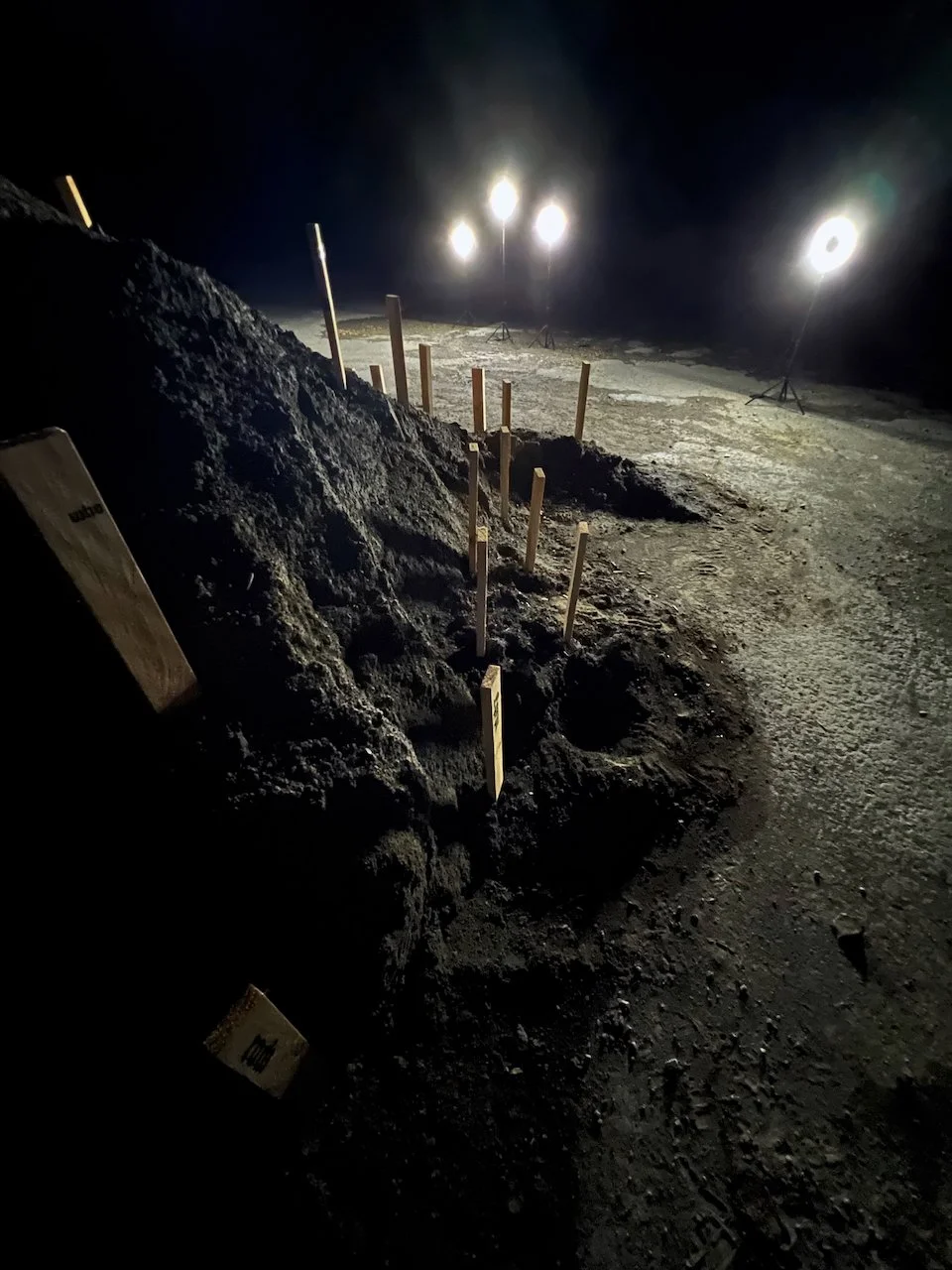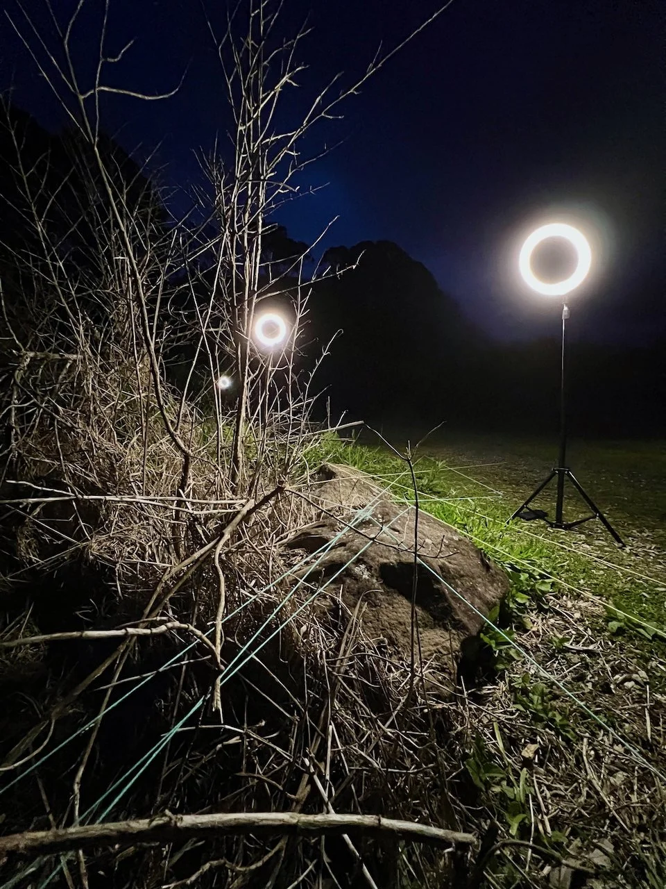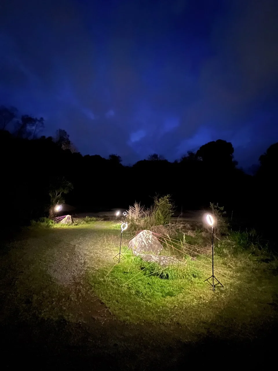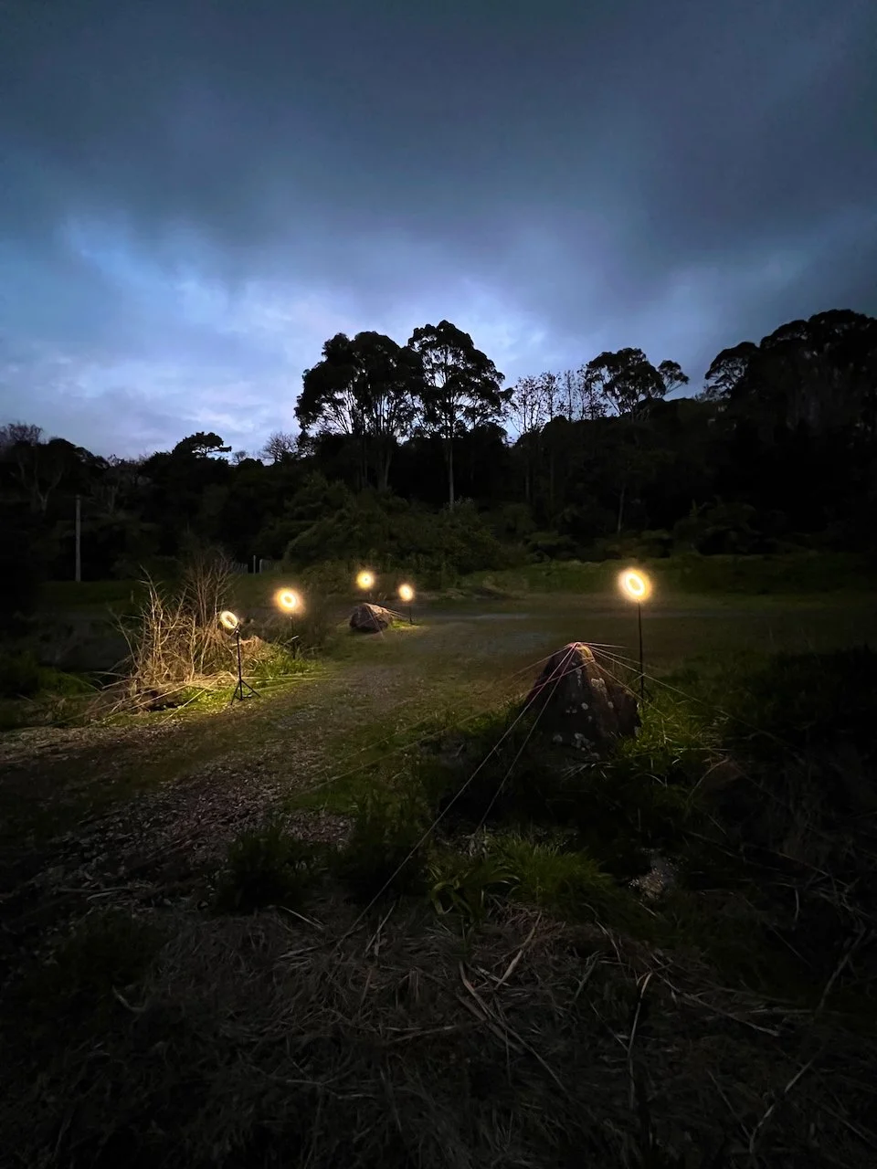 Each stone is protected by a web of coloured yarn pinned to the surrounding soil with steel tent pegs. This references the rug making, weaving, and tapestry prisoners could engage in to help grow and maintain positive mental health outcomes. The work is lit with LED’s during the night.