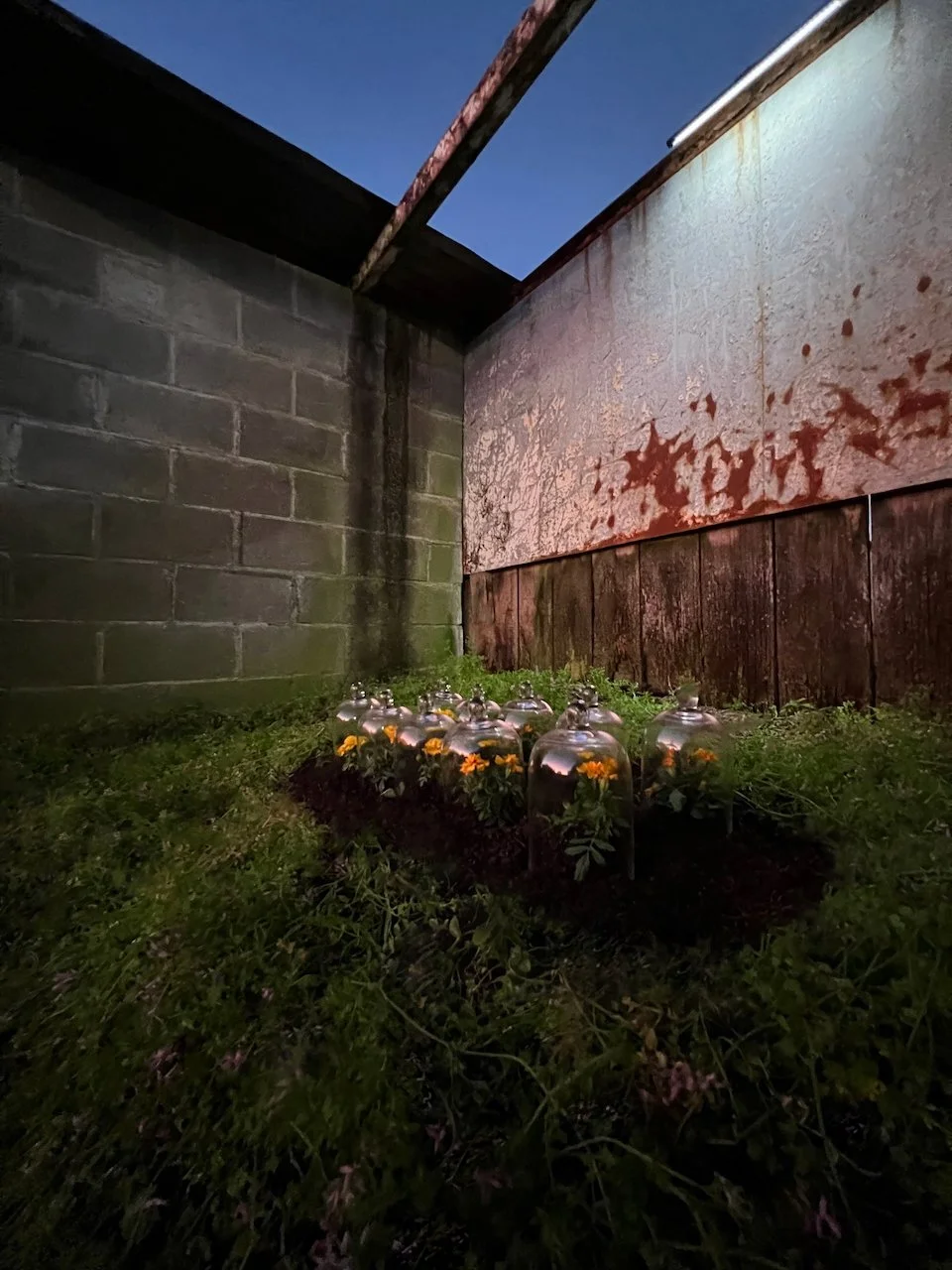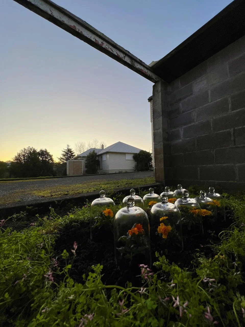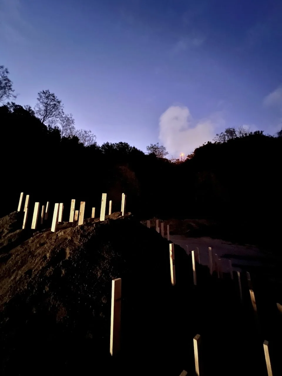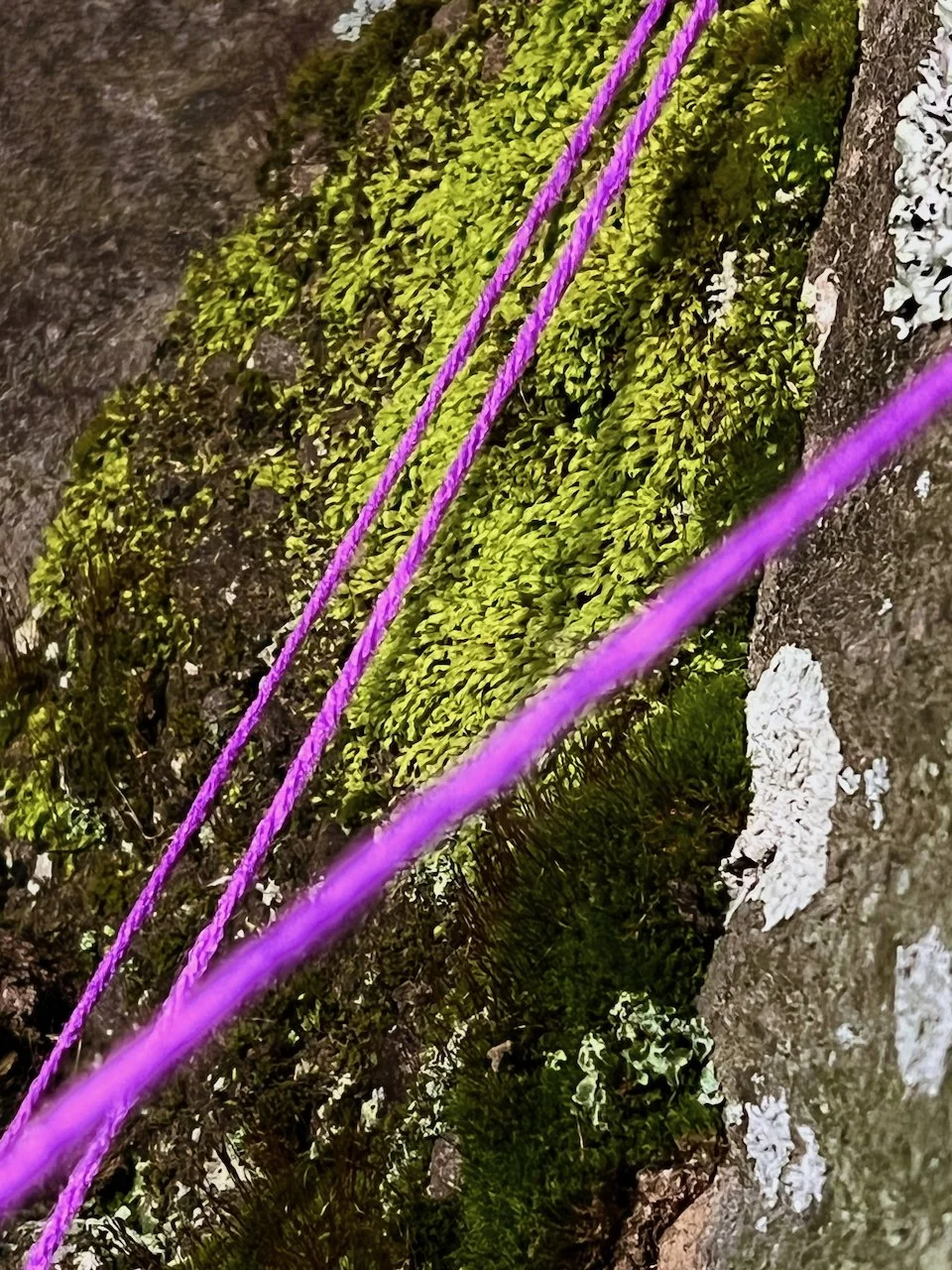 Each stone is protected by a web of coloured yarn pinned to the surrounding soil with steel tent pegs. This references the rug making, weaving, and tapestry prisoners could engage in to help grow and maintain positive mental health outcomes. The work is lit with LED’s during the night.