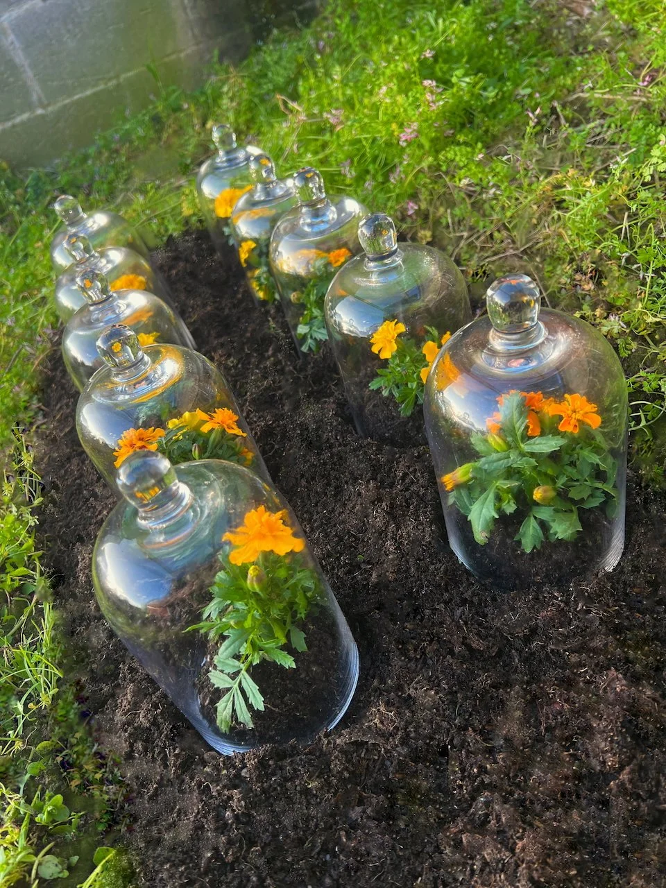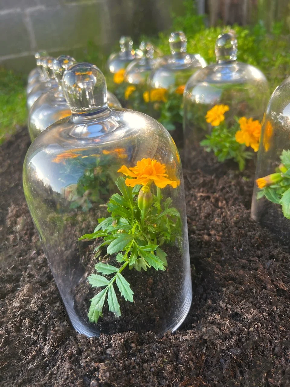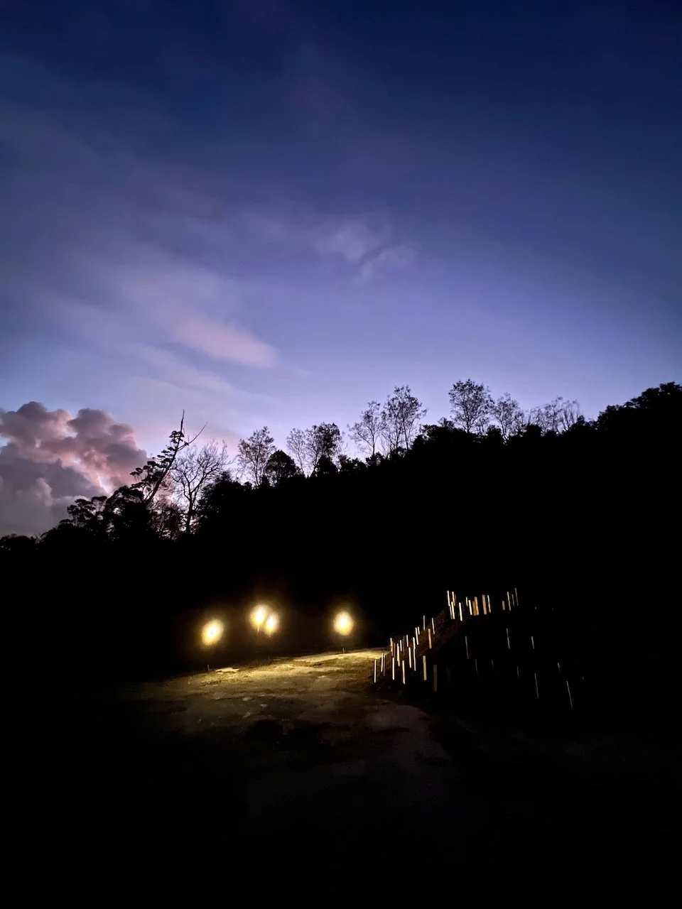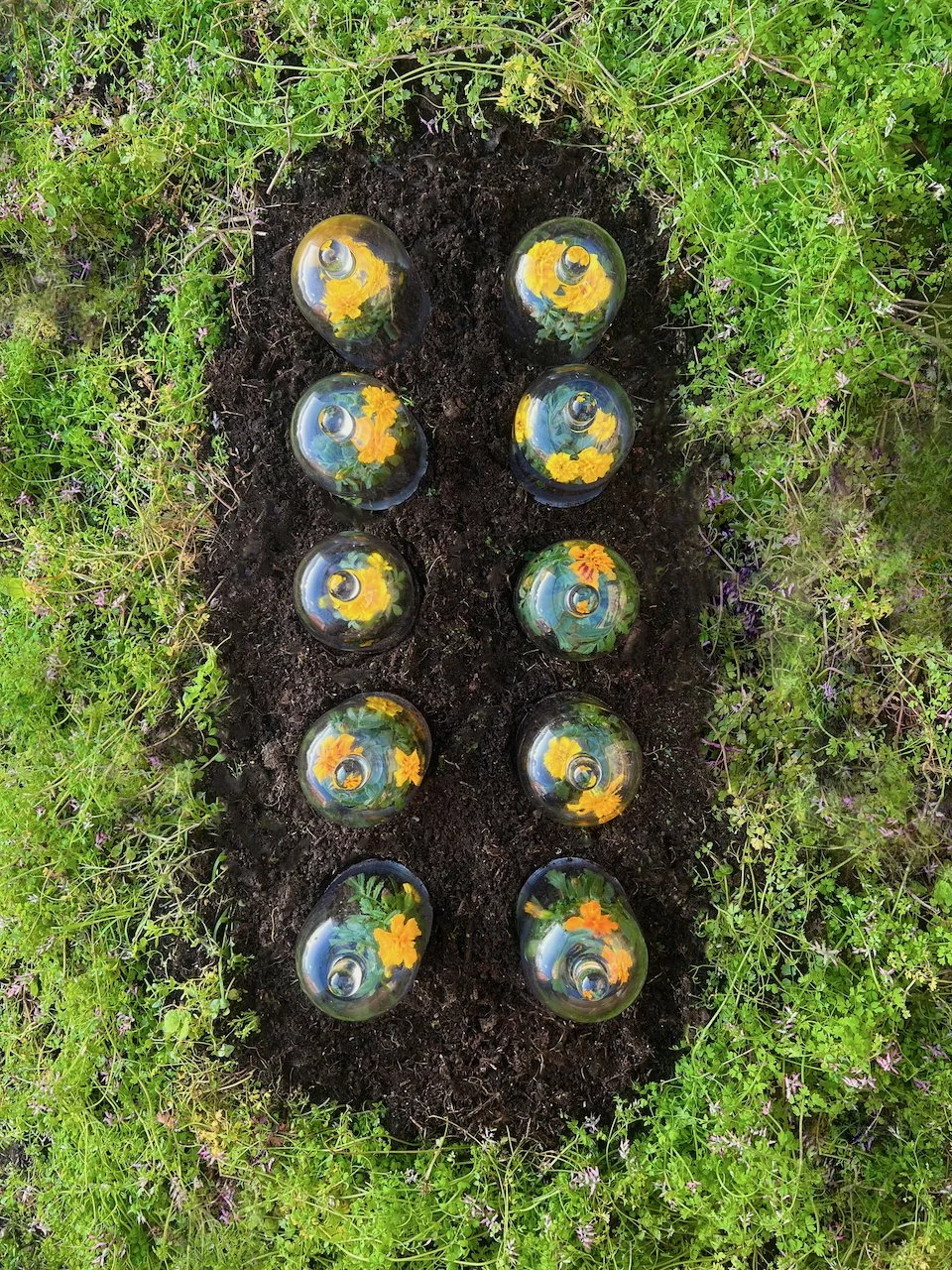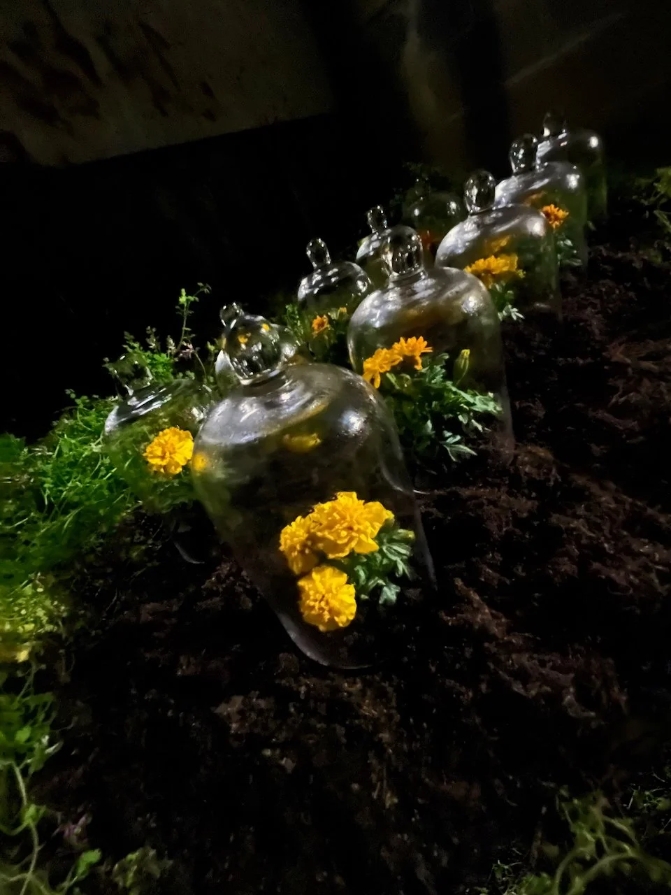 Each stone is protected by a web of coloured yarn pinned to the surrounding soil with steel tent pegs. This references the rug making, weaving, and tapestry prisoners could engage in to help grow and maintain positive mental health outcomes. The work is lit with LED’s during the night.