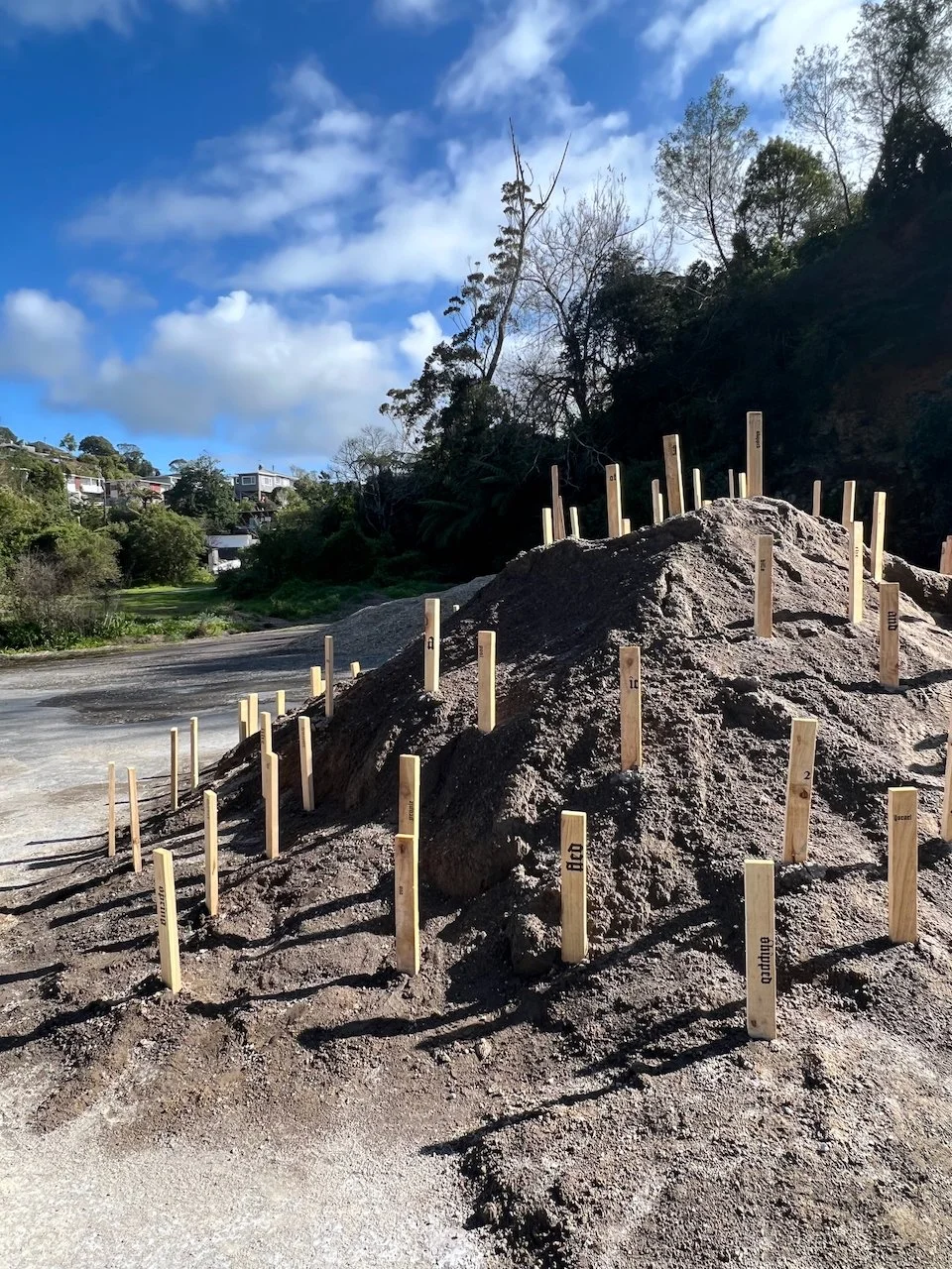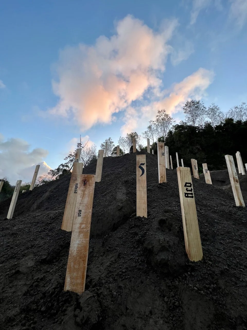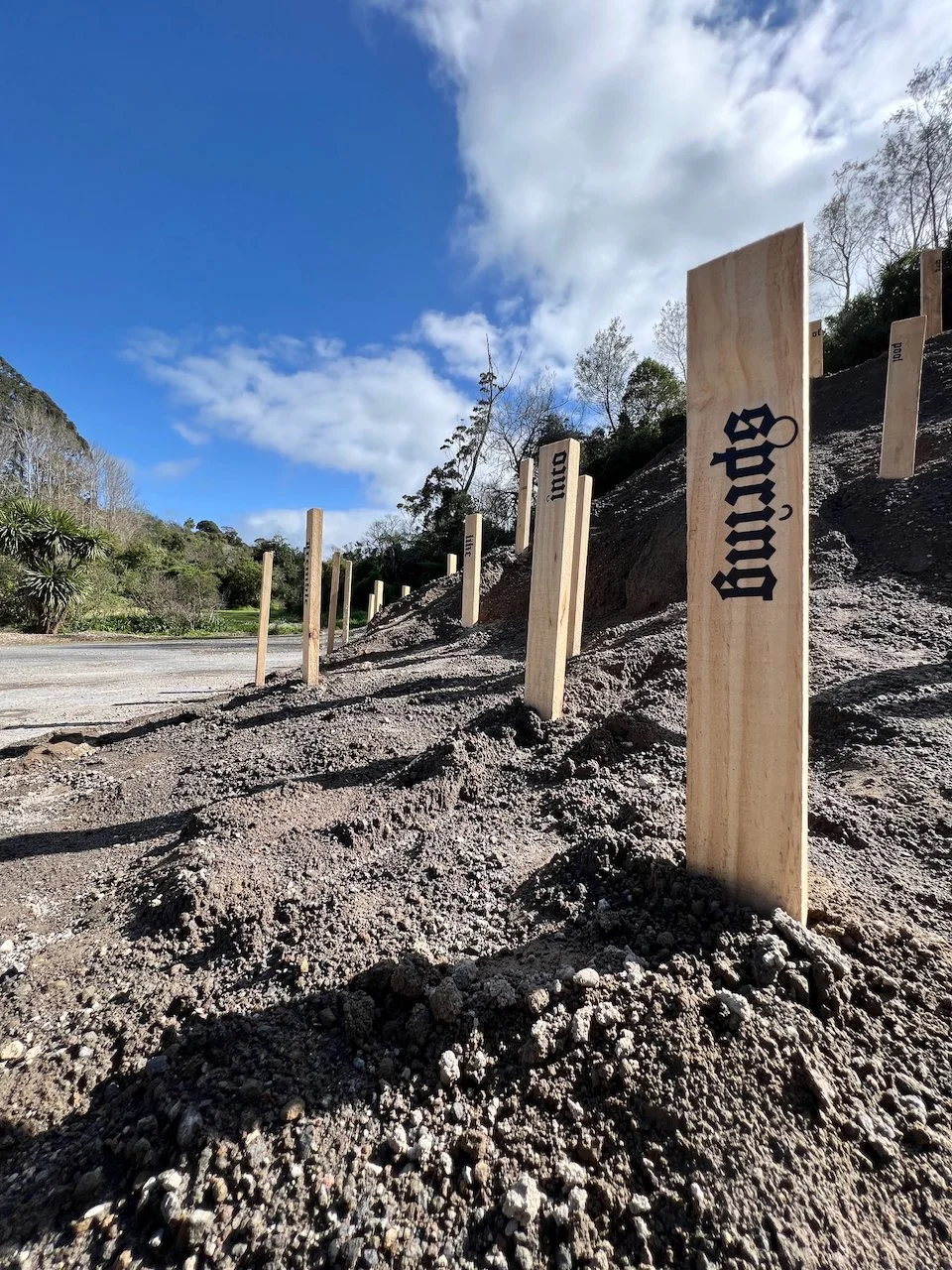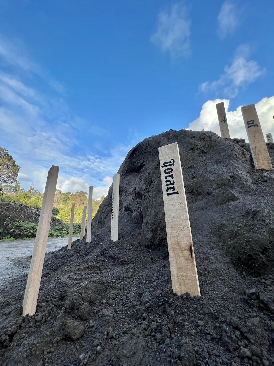 Sited at the New Plymouth Prison quarry, 114 pine stakes are driven into a mountainous pile of soil, representing the 114 gay men. Each stake bears a word or number taken from Psalm 114 in the Bible which happens to have 114 words/numbers in the Modern English Version (MEV). One central theme in Psalm 114 has been described as release from captivity.