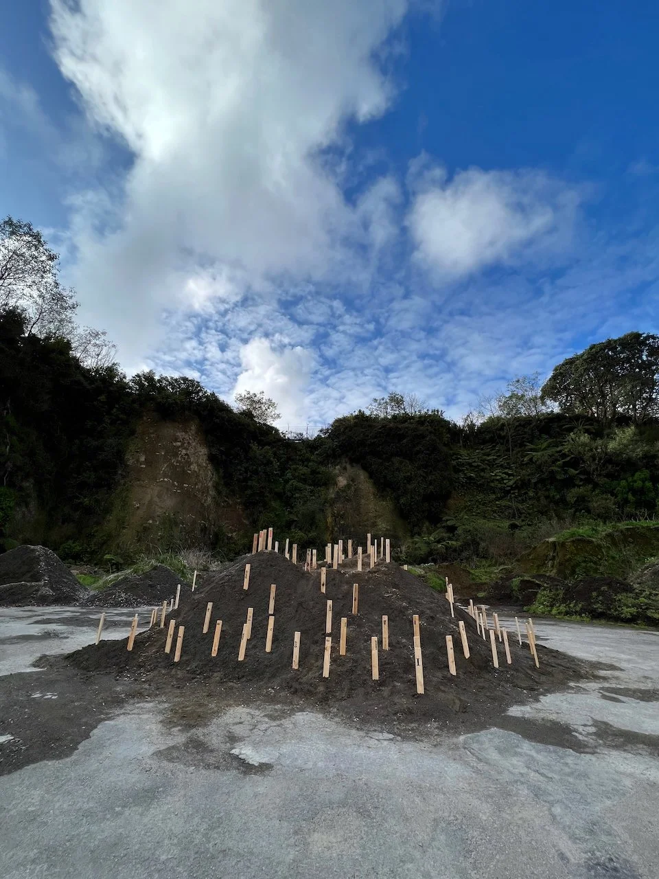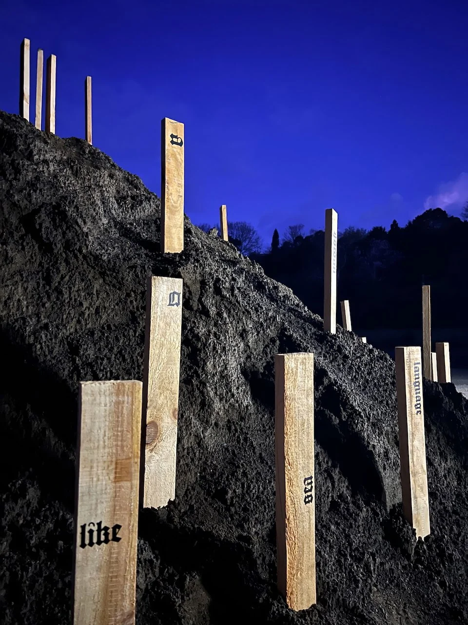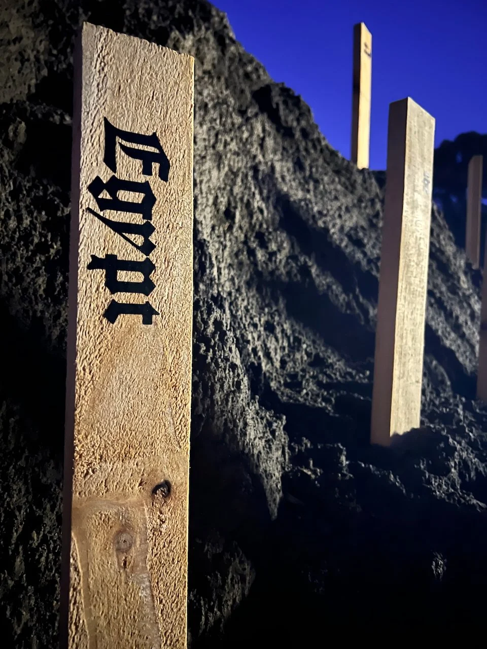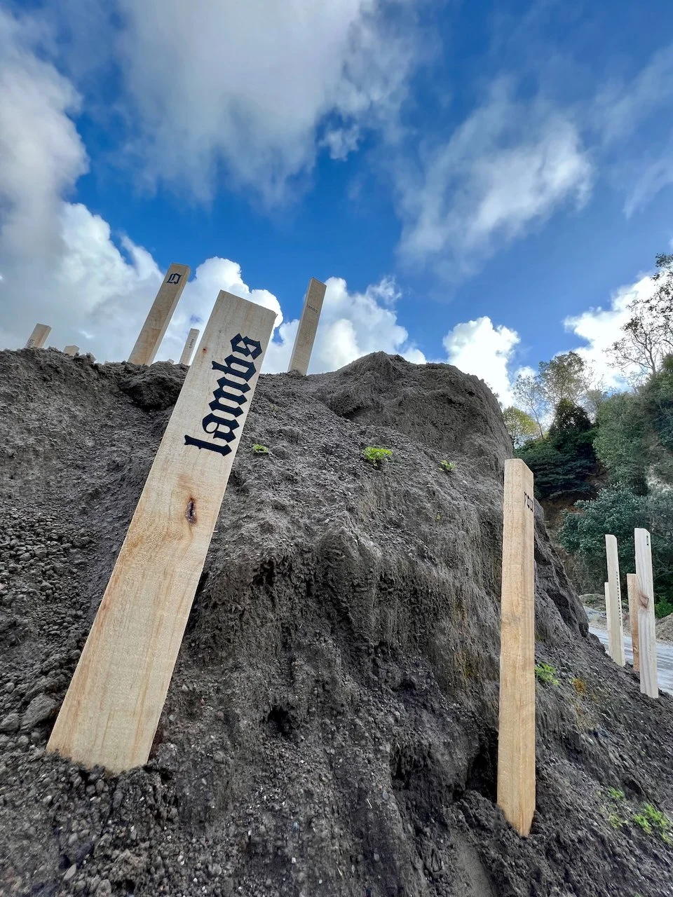Sited at the New Plymouth Prison quarry, 114 pine stakes are driven into a mountainous pile of soil, representing the 114 gay men. Each stake bears a word or number taken from Psalm 114 in the Bible which happens to have 114 words/numbers in the Modern English Version (MEV). One central theme in Psalm 114 has been described as release from captivity.