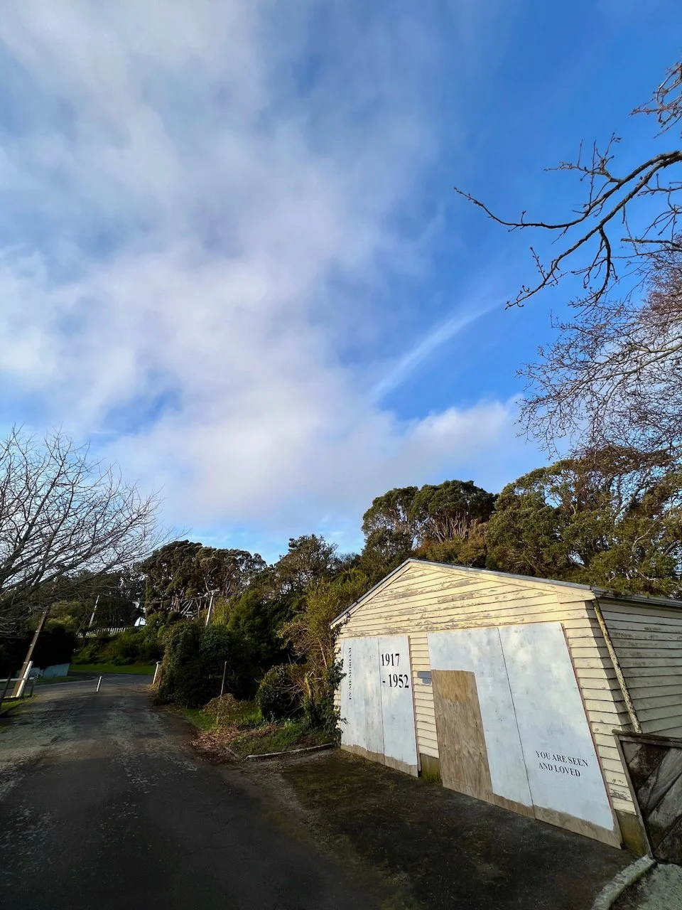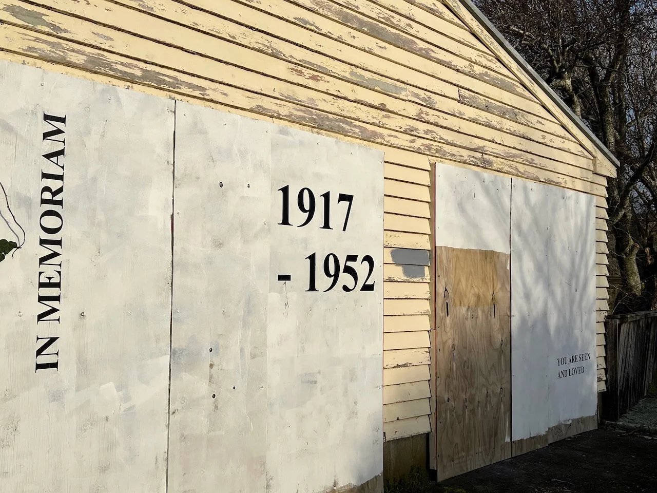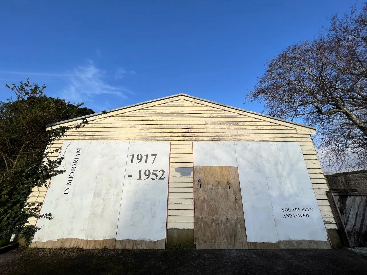 This work acknowledges and makes visible the New Plymouth Prison as a site of significance to queer communities. The work is sited on the temporary hoardings of a building near the main prison entrance off the road. The text reads “IN MEMORIAM”, “1917 – 1952”, and “YOU ARE SEEN AND LOVED”.