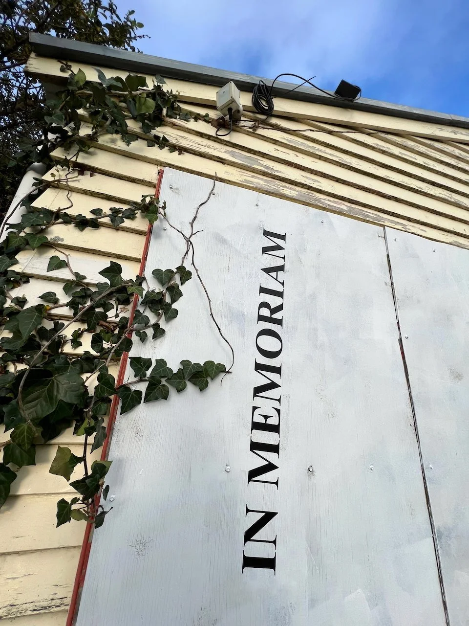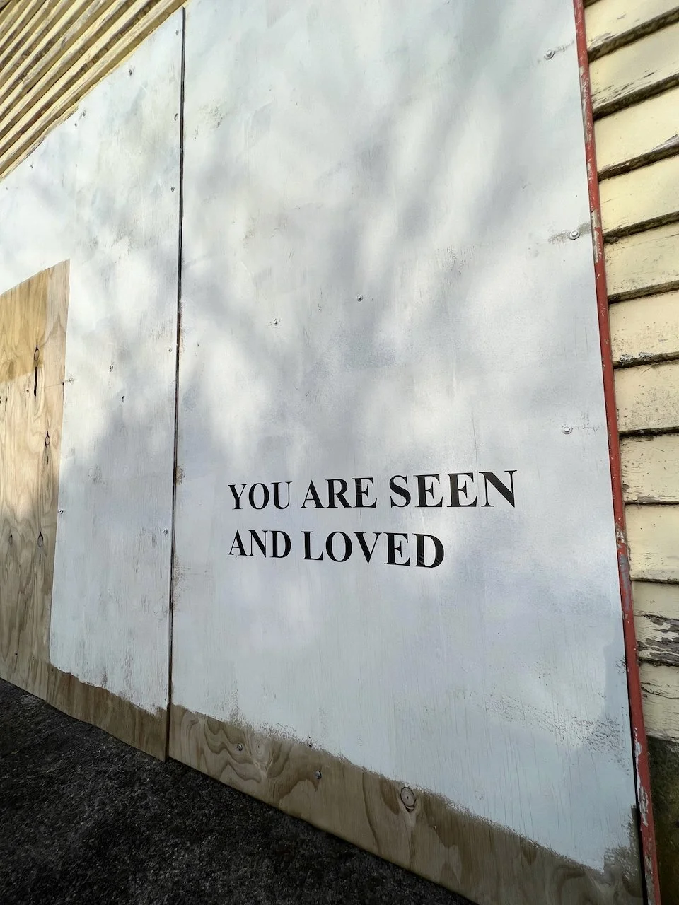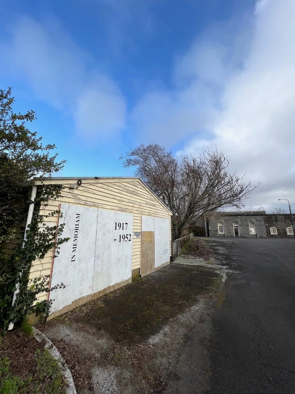 This work acknowledges and makes visible the New Plymouth Prison as a site of significance to queer communities. The work is sited on the temporary hoardings of a building near the main prison entrance off the road. The text reads “IN MEMORIAM”, “1917 – 1952”, and “YOU ARE SEEN AND LOVED”.