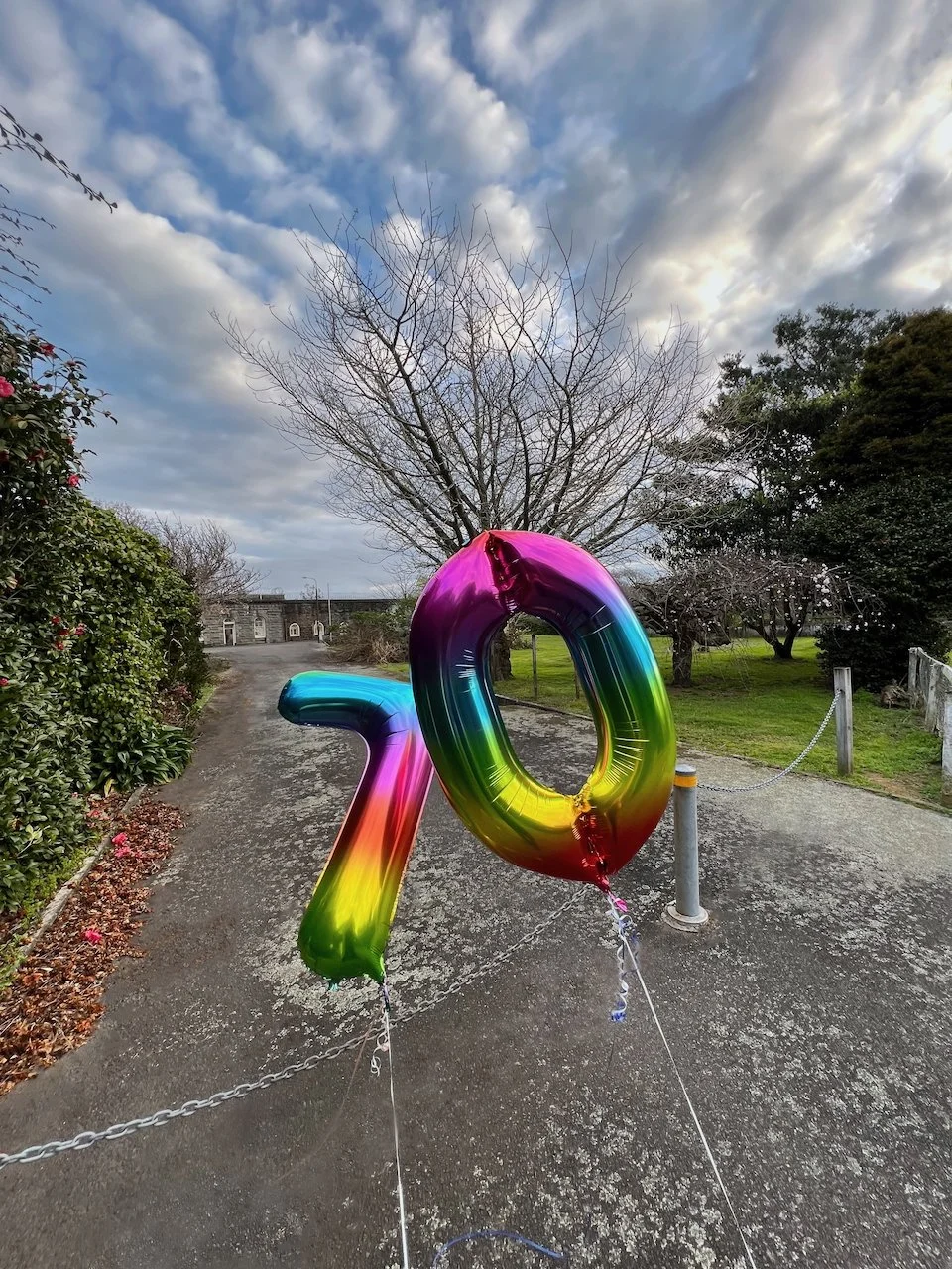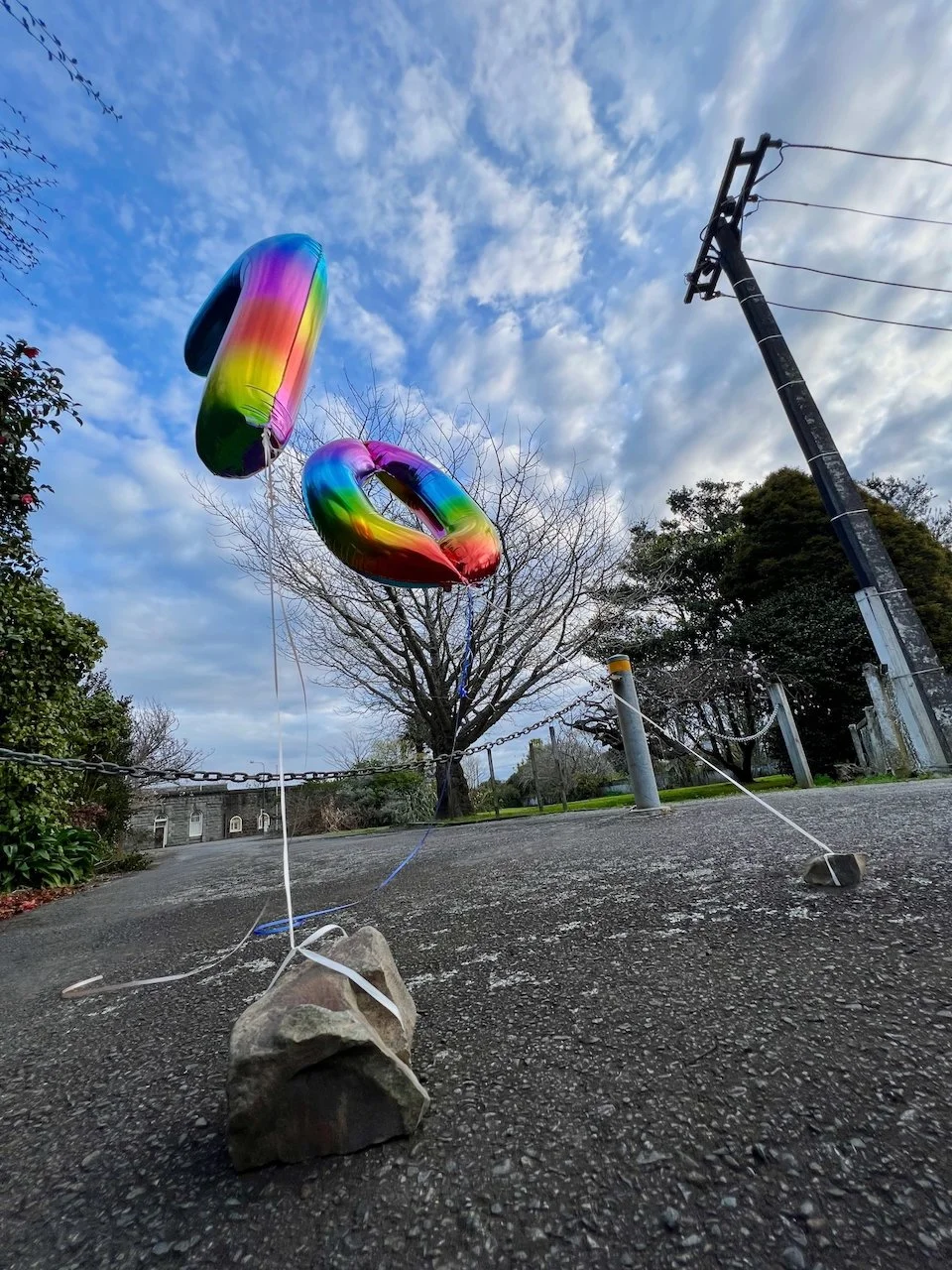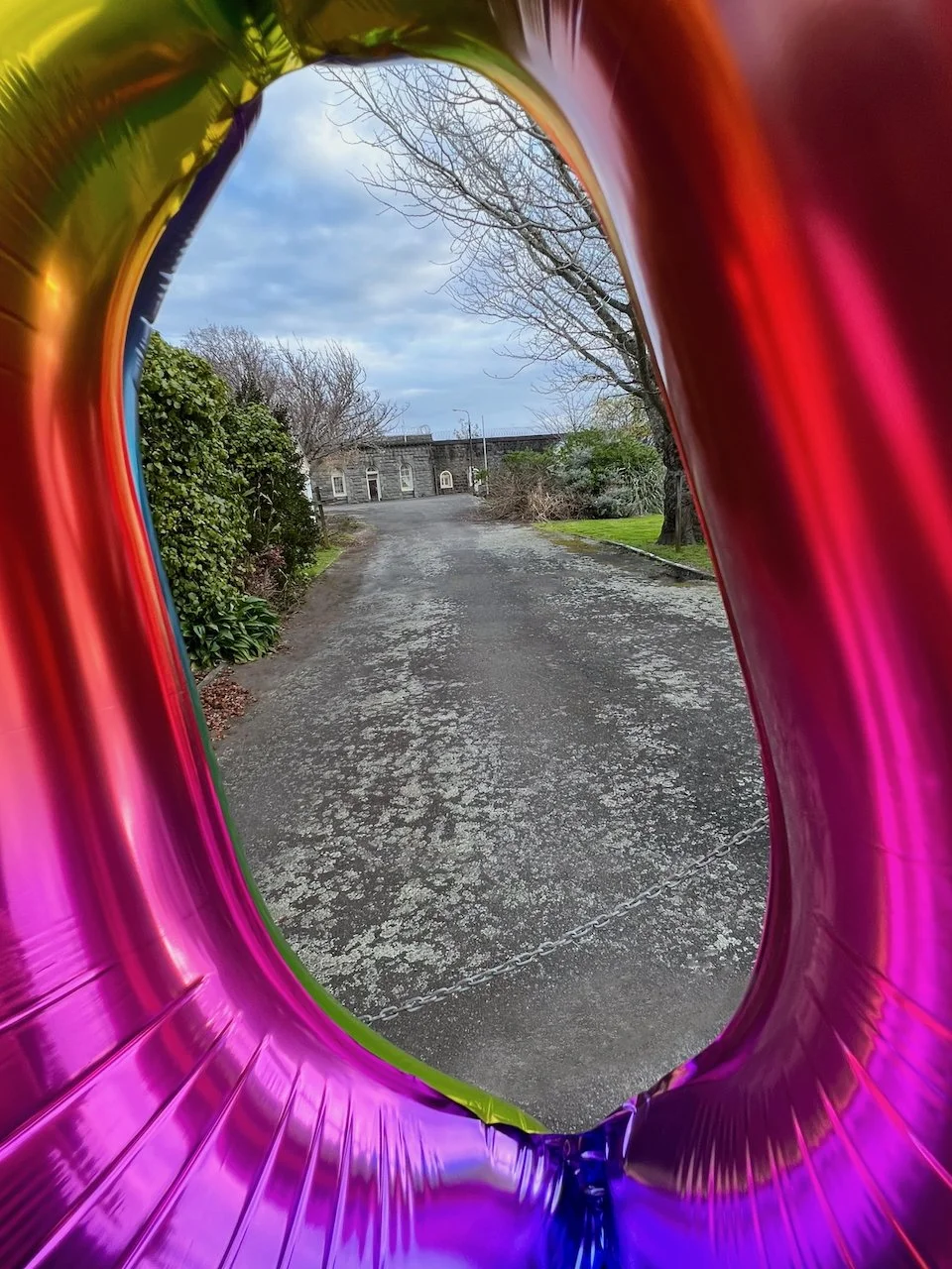 This work acknowledges the 70 year anniversary since the New Plymouth Prison was no longer used as the centralised prison for men convicted of homosexuality in New Zealand. Two foil balloons are placed at the main entrance of the prison, anchored to the ground with rocks taken from the quarry attached to the prison.