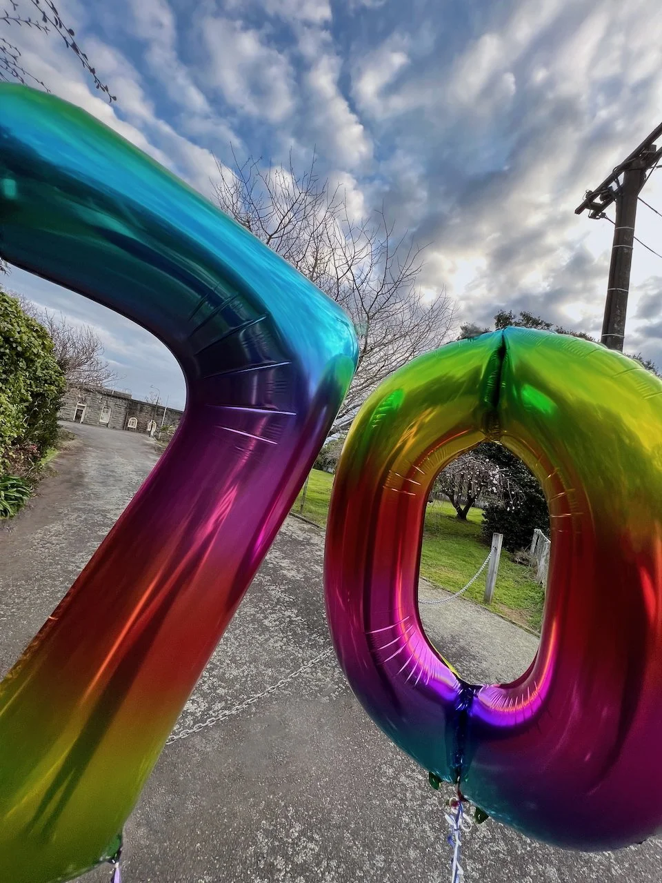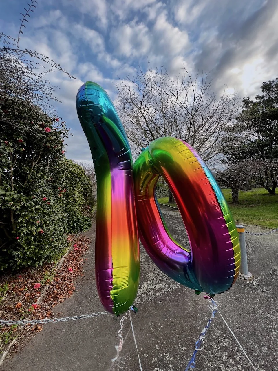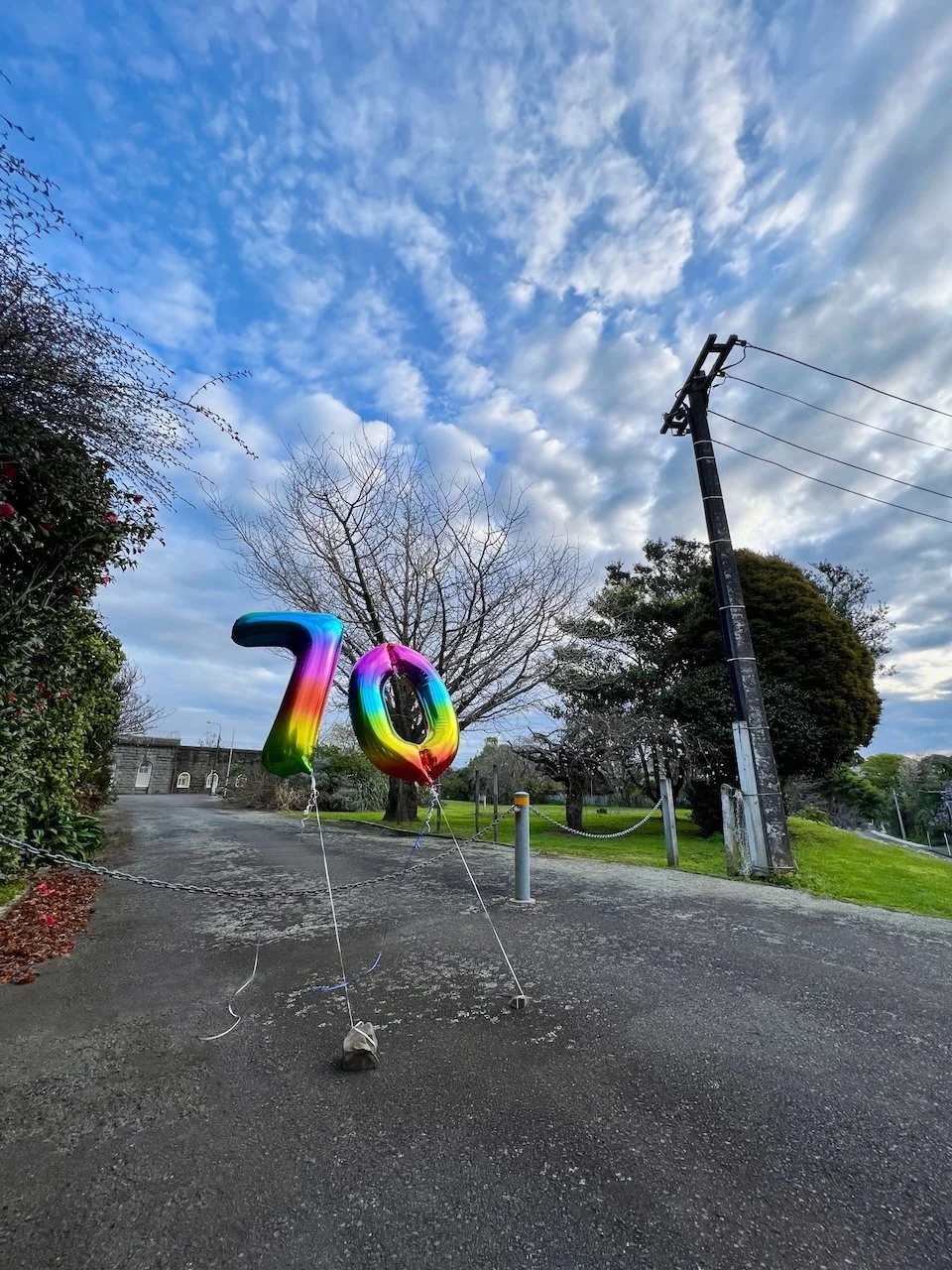 This work acknowledges the 70 year anniversary since the New Plymouth Prison was no longer used as the centralised prison for men convicted of homosexuality in New Zealand. Two foil balloons are placed at the main entrance of the prison, anchored to the ground with rocks taken from the quarry attached to the prison.