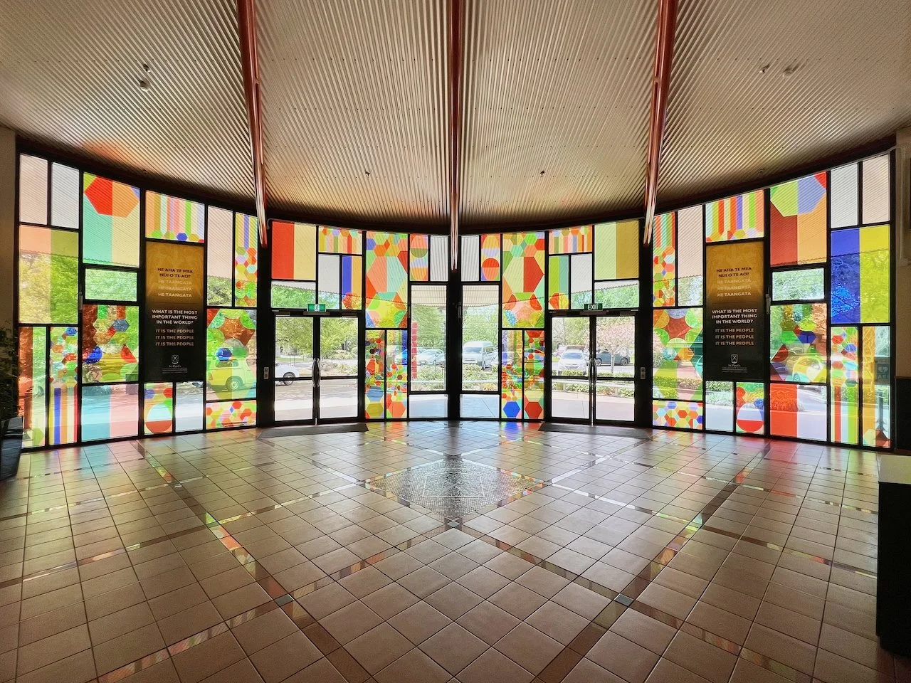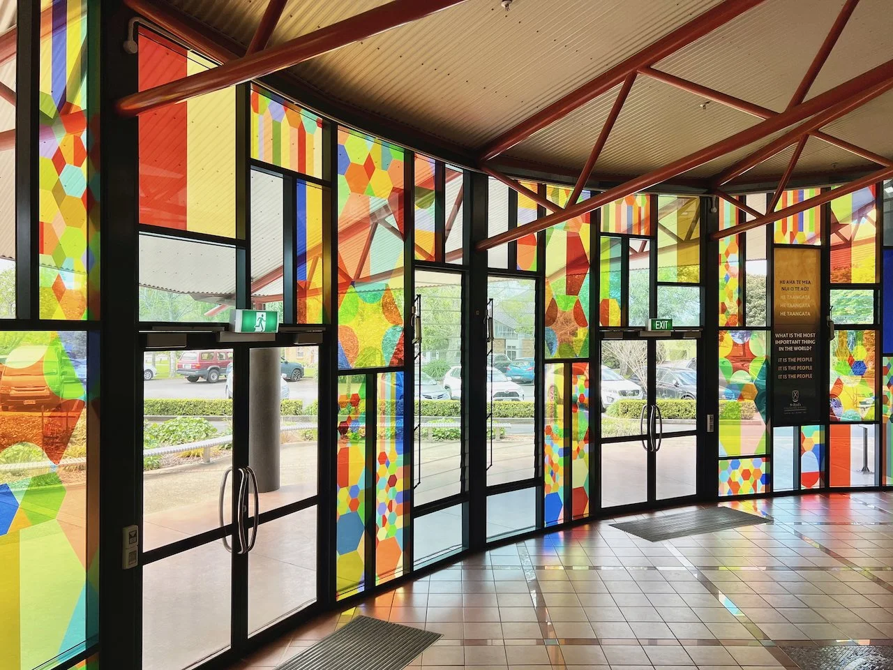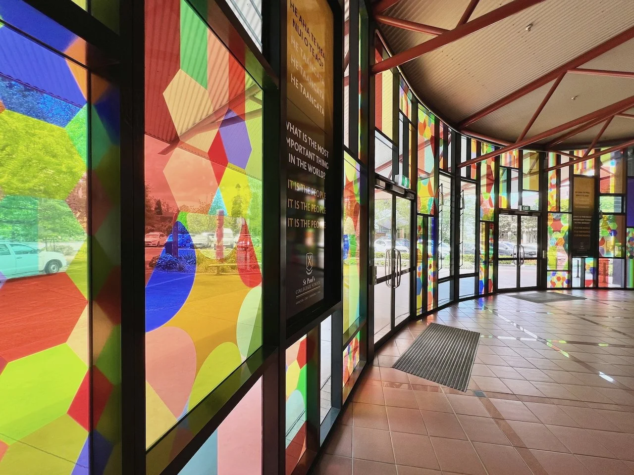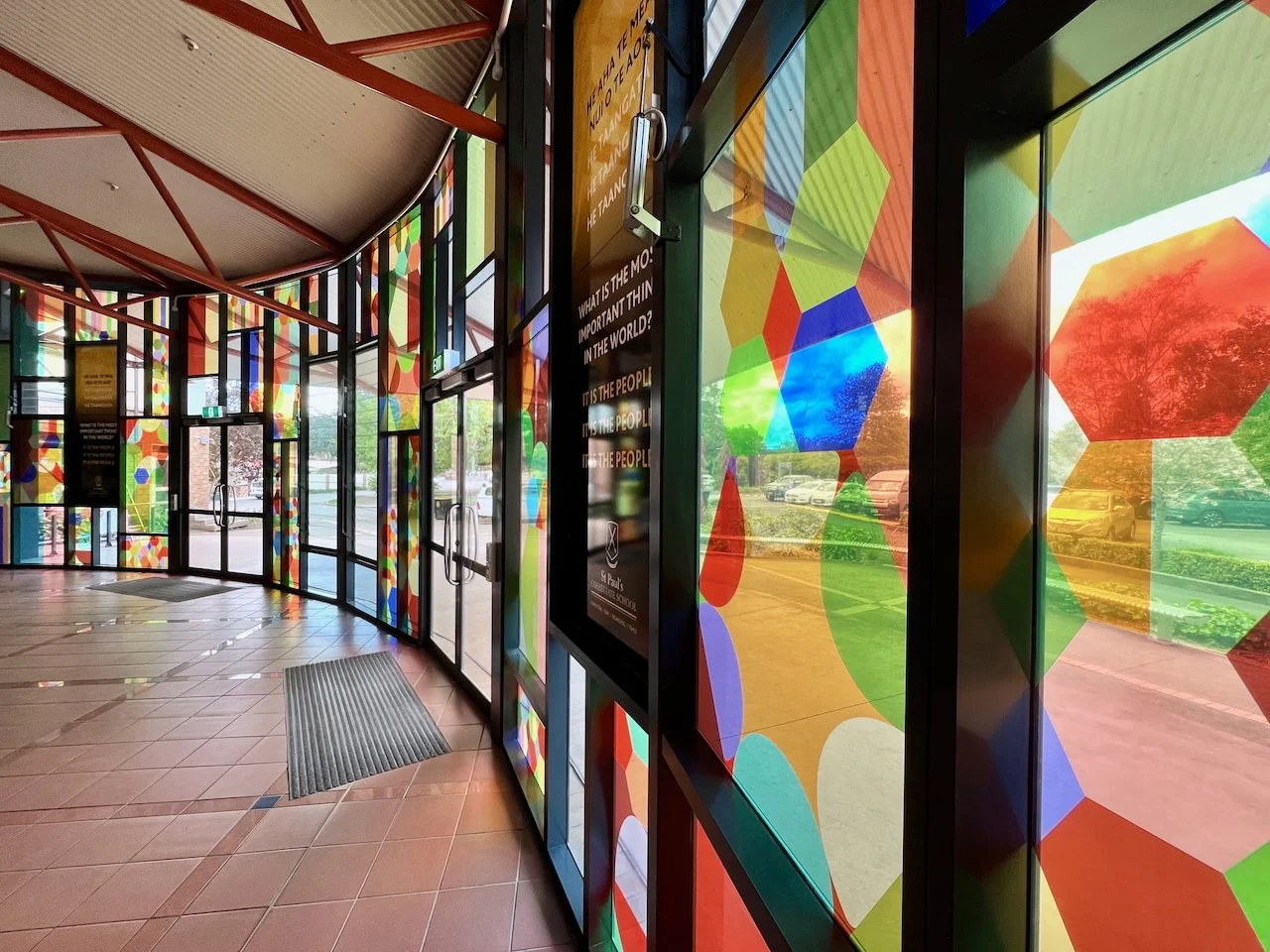 Kinship is a work commissioned by St Paul’s Collegiate School in Kirikiriroa/Hamilton, curated by Head of Art, Jonathan Cameron, and collaboratively developed with the Year 13 cohort (2024). The focus of the work is on welcoming people from all walks of life, sited in the entryway to the student centre, the hub of the school.