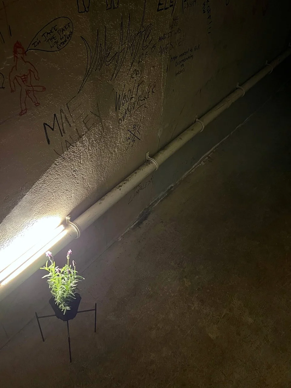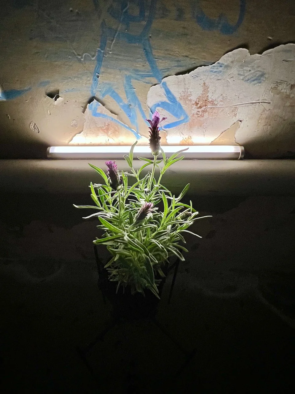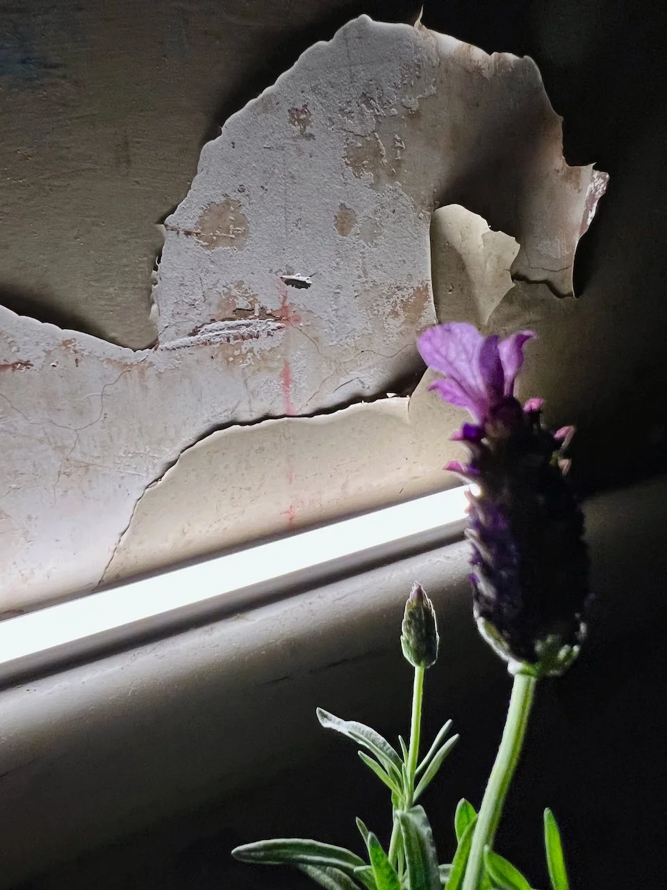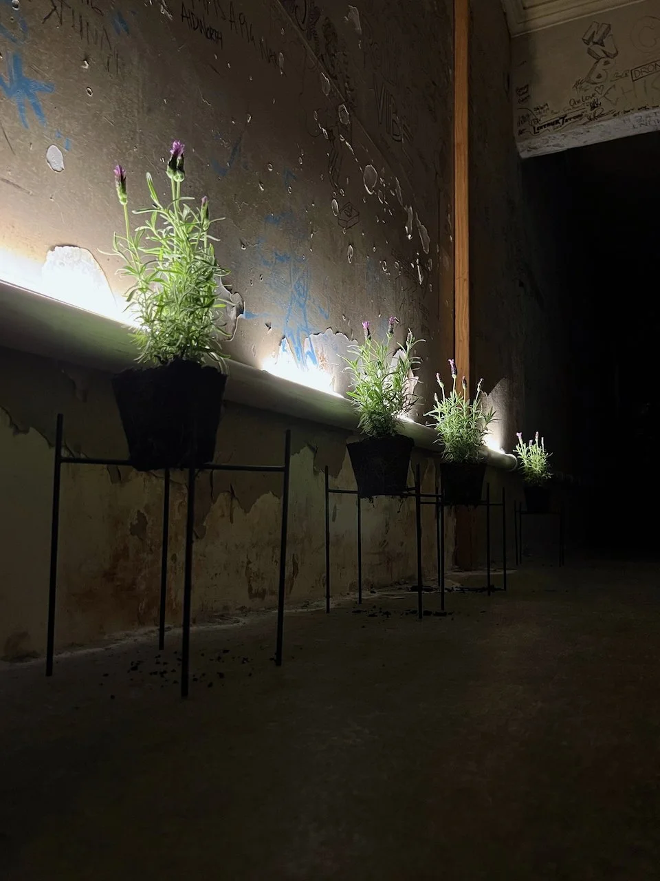 This work explores the healing process in local queer communities. The work is sited in a green room near the main stage in the theatre. It is a long narrow corridor with one wall covered in writing and imagery from people that have performed at The Mayfair in the past. Unpotted lavender plants line this wall on metal stands and are illuminated with LED lights. The defaced and deteriorated walls echo the violence, bullying, and hate speech local queer communities experience. The lavender seeks to counter this negativity and heal damage done. Lavender was used in ancient times to wash and cleanse wounds and more recently has been adopted as a symbol of resistance by queer communities. The space itself as a green room is a waiting or transitory space that in this work, symbolises hope for a better future.