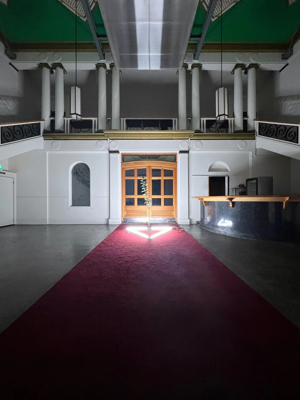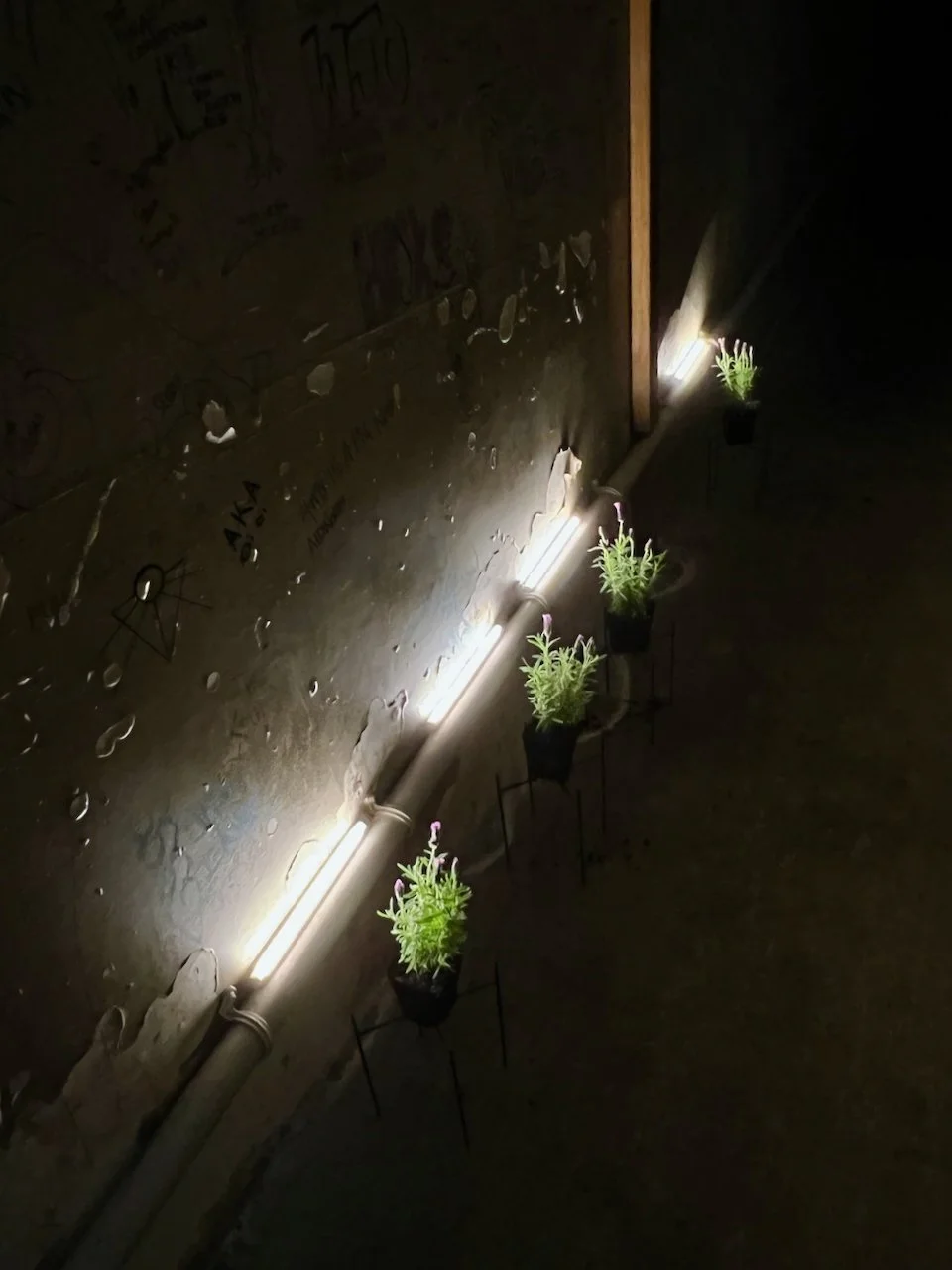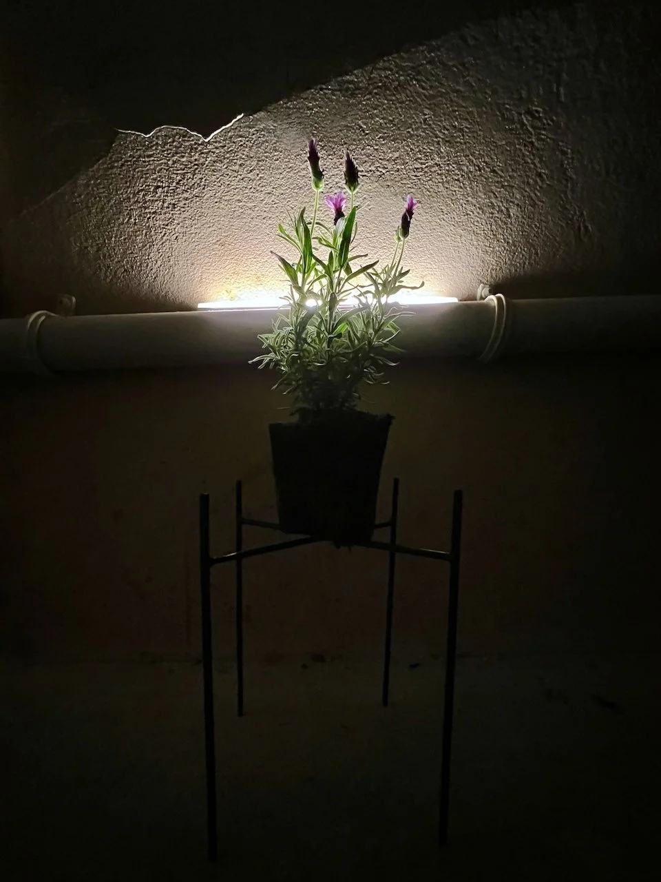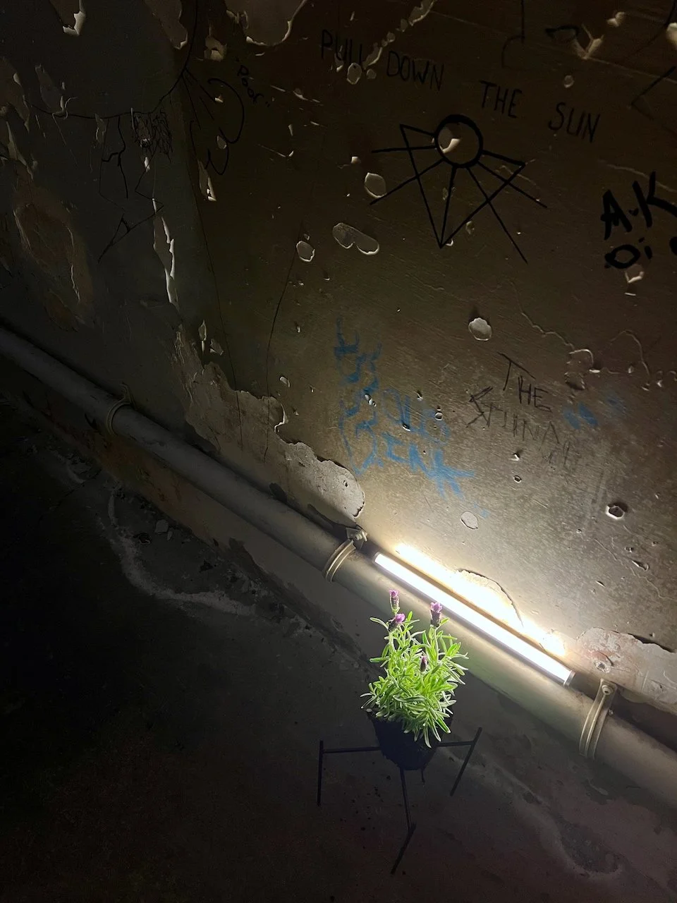This work explores the healing process in local queer communities. The work is sited in a green room near the main stage in the theatre. It is a long narrow corridor with one wall covered in writing and imagery from people that have performed at The Mayfair in the past. Unpotted lavender plants line this wall on metal stands and are illuminated with LED lights. The defaced and deteriorated walls echo the violence, bullying, and hate speech local queer communities experience. The lavender seeks to counter this negativity and heal damage done. Lavender was used in ancient times to wash and cleanse wounds and more recently has been adopted as a symbol of resistance by queer communities. The space itself as a green room is a waiting or transitory space that in this work, symbolises hope for a better future.