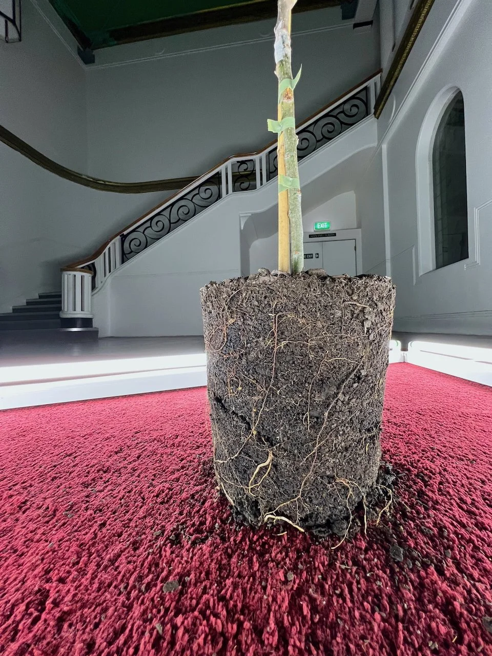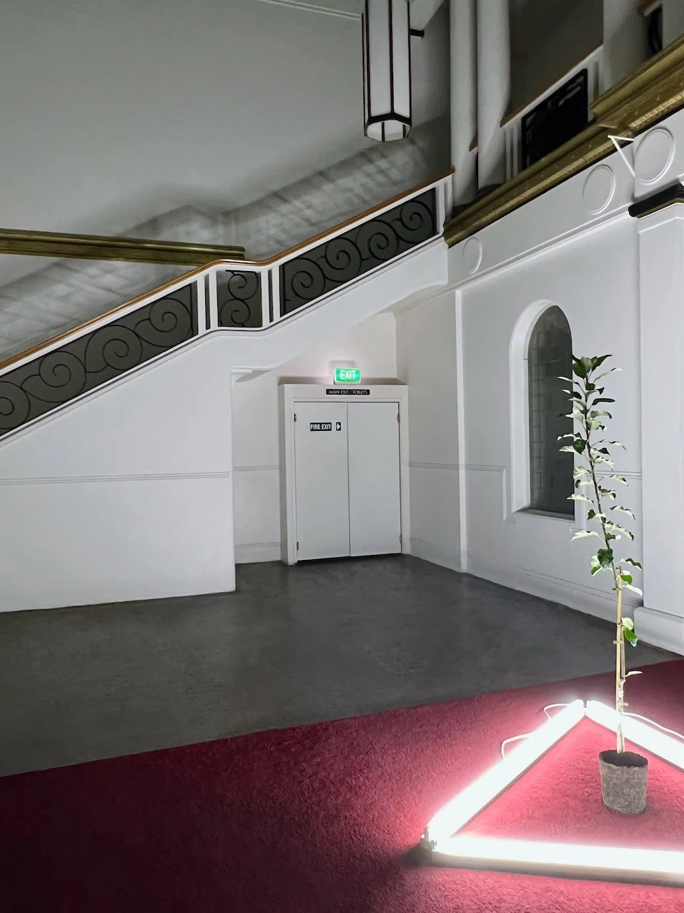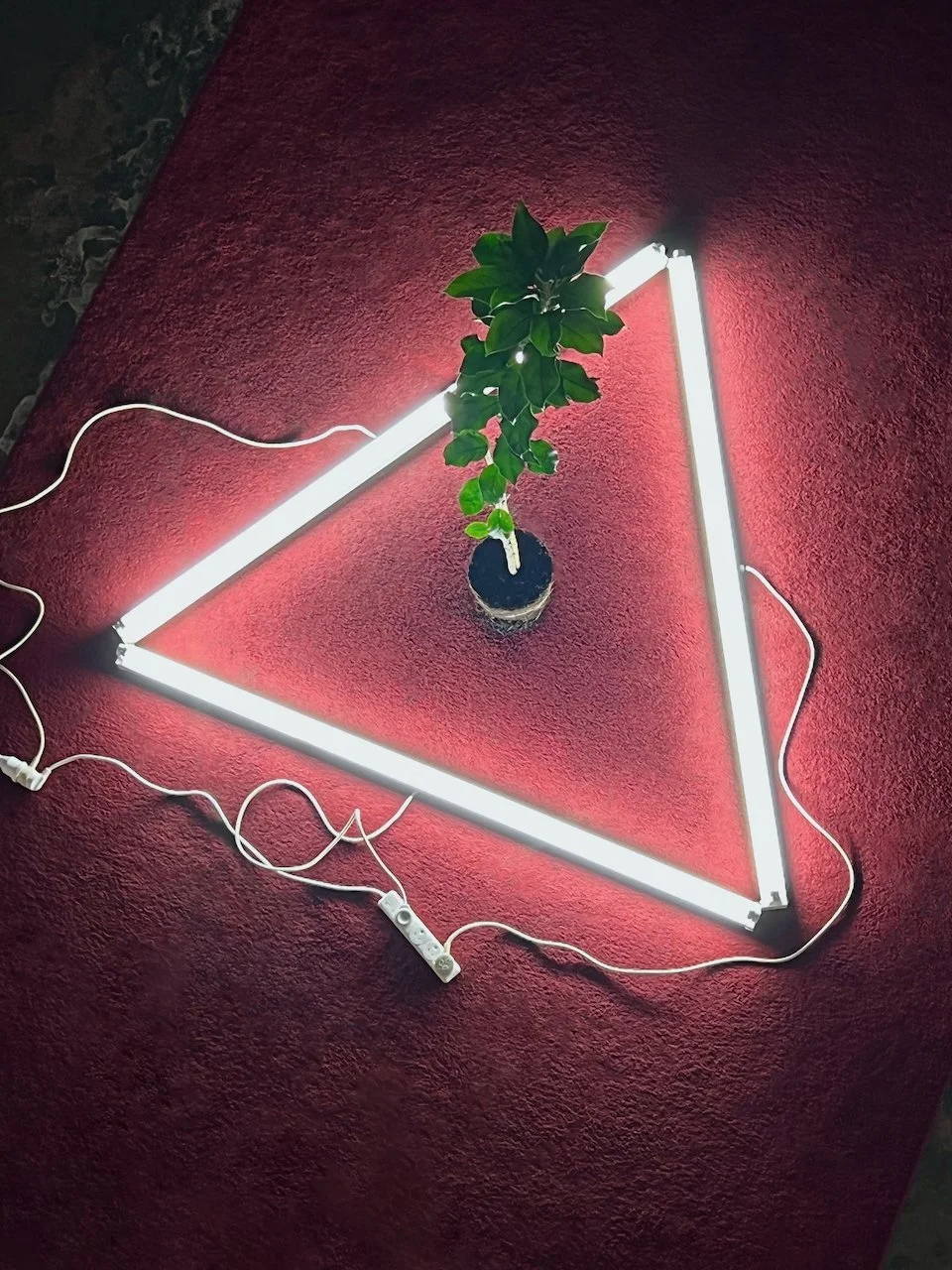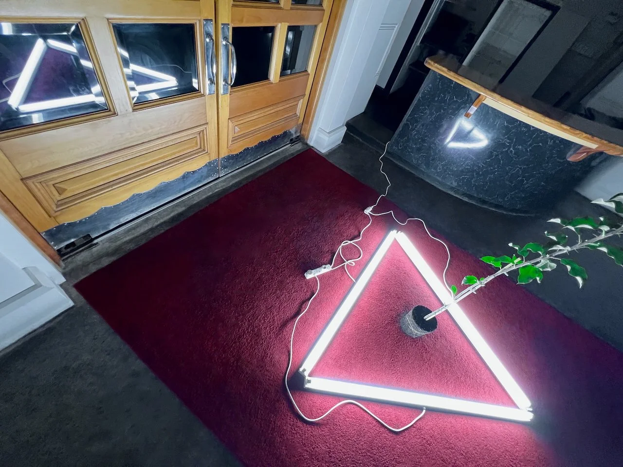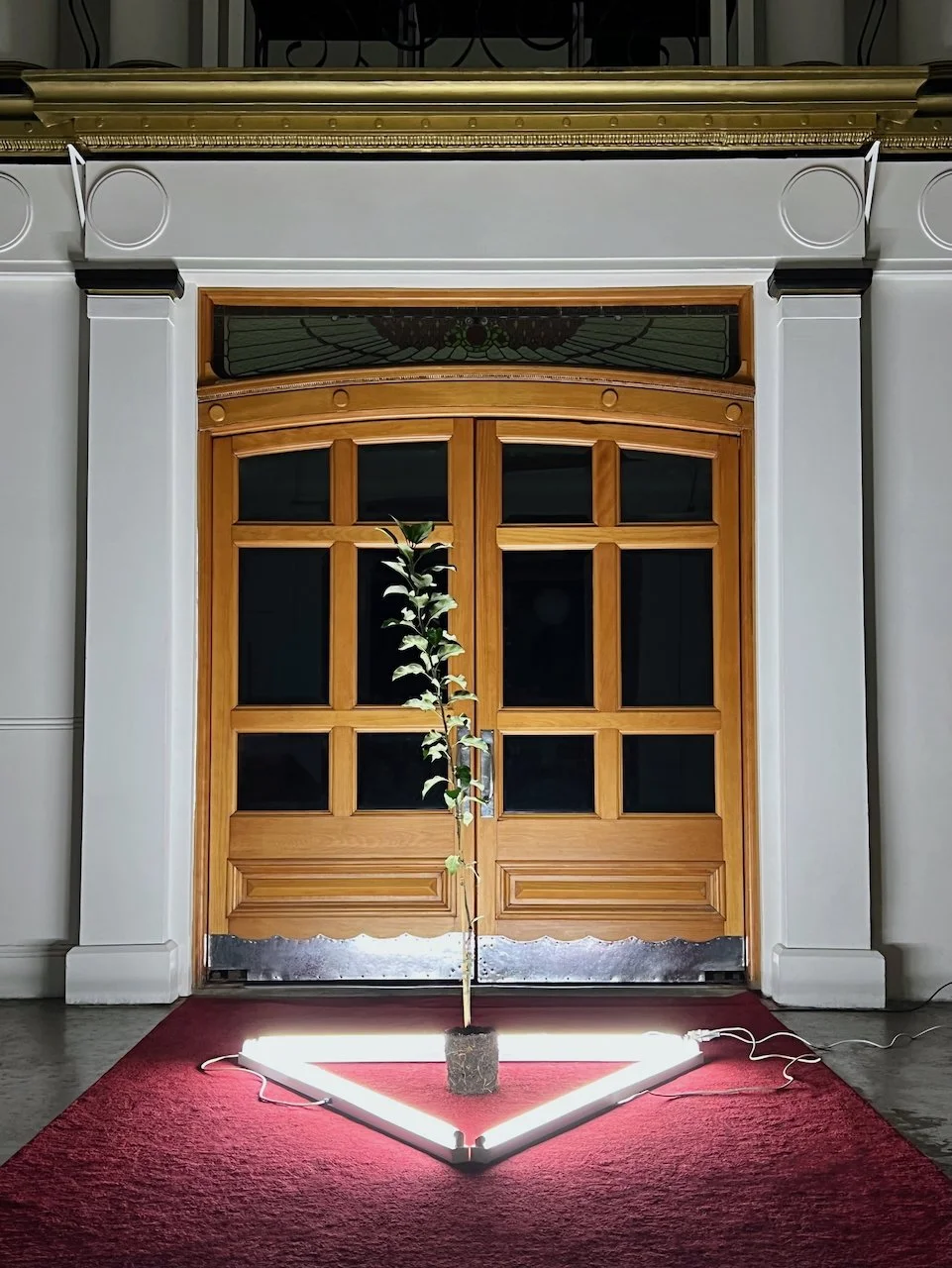 This work acknowledges those in local queer communities that may be suffering in silence. Like a silent film they may be seen but not heard. Sited in the main theatre foyer, an apple tree sits unpotted in the centre of three fluorescent lights that form a triangle. The apple tree references the death of Alan Turing (1912 - 1954), a British mathematician who was gay and convicted for sex with another man. His cause of death was cyanide poisoning and it was speculated this came from a half-eaten apple found beside Turing’s bed, an apple he had poisoned himself. The light triangle refers to the pink triangle, a symbol reclaimed by queer communities symbolising pride, solidarity, and resistance. It is a triangle that seeks to transmute the apple/apple tree into another positive symbol for queer communities, a symbol of acknowledgement, awareness, and hope for those suffering in silence.