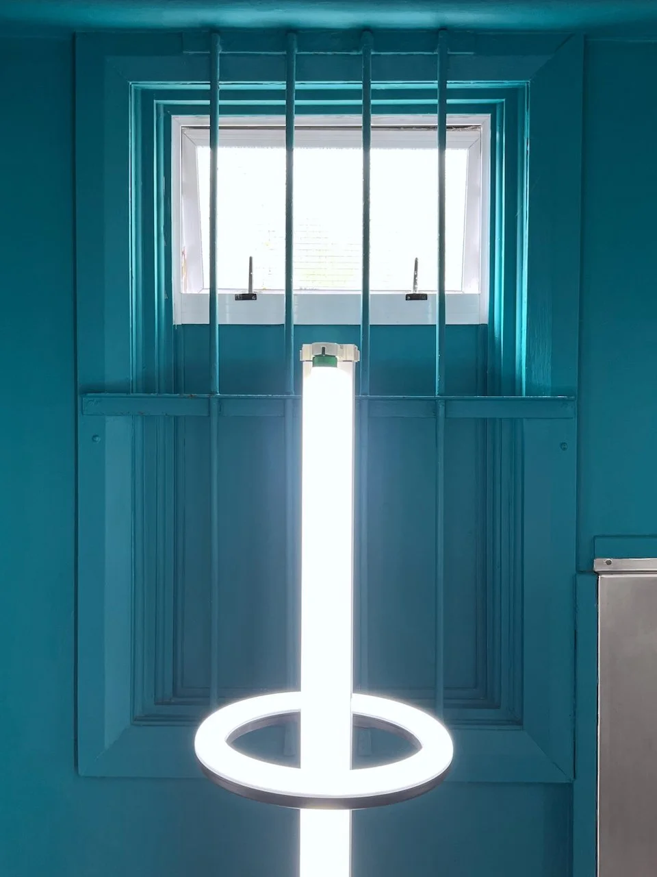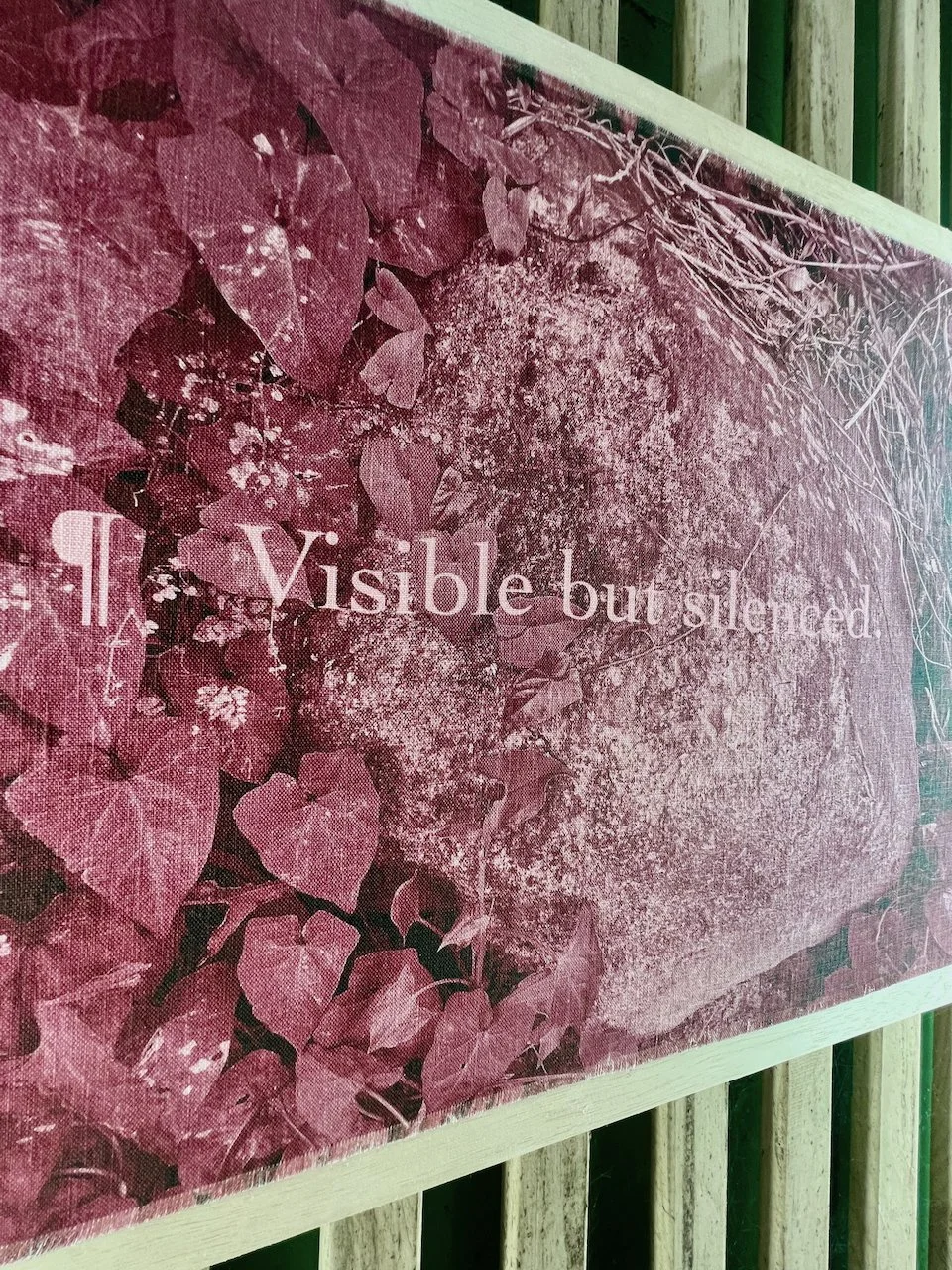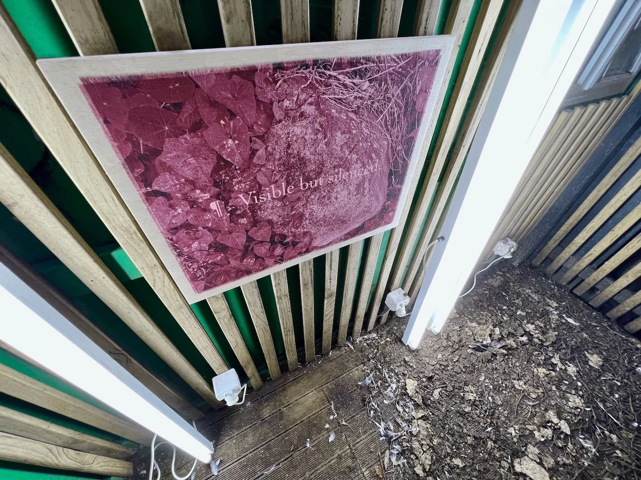 The phrase Visible but silenced echo the lives of local gay prisoners at the time but also refer to the lives of local queer people today who feel muted or held back by society in some way. The phrase is held captive and neglected in a room with a skylight that has allowed birds to nest and defecate in the space over time. The public can view the room through large windows like one would view animals at the zoo.