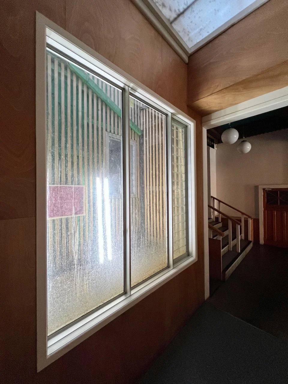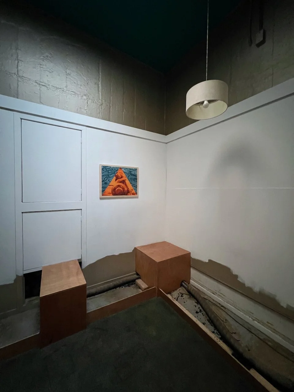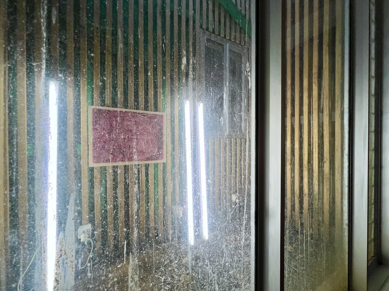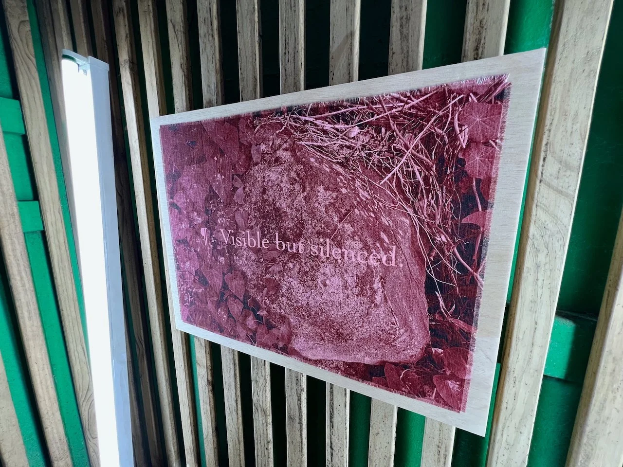 The phrase Visible but silenced echo the lives of local gay prisoners at the time but also refer to the lives of local queer people today who feel muted or held back by society in some way. The phrase is held captive and neglected in a room with a skylight that has allowed birds to nest and defecate in the space over time. The public can view the room through large windows like one would view animals at the zoo.