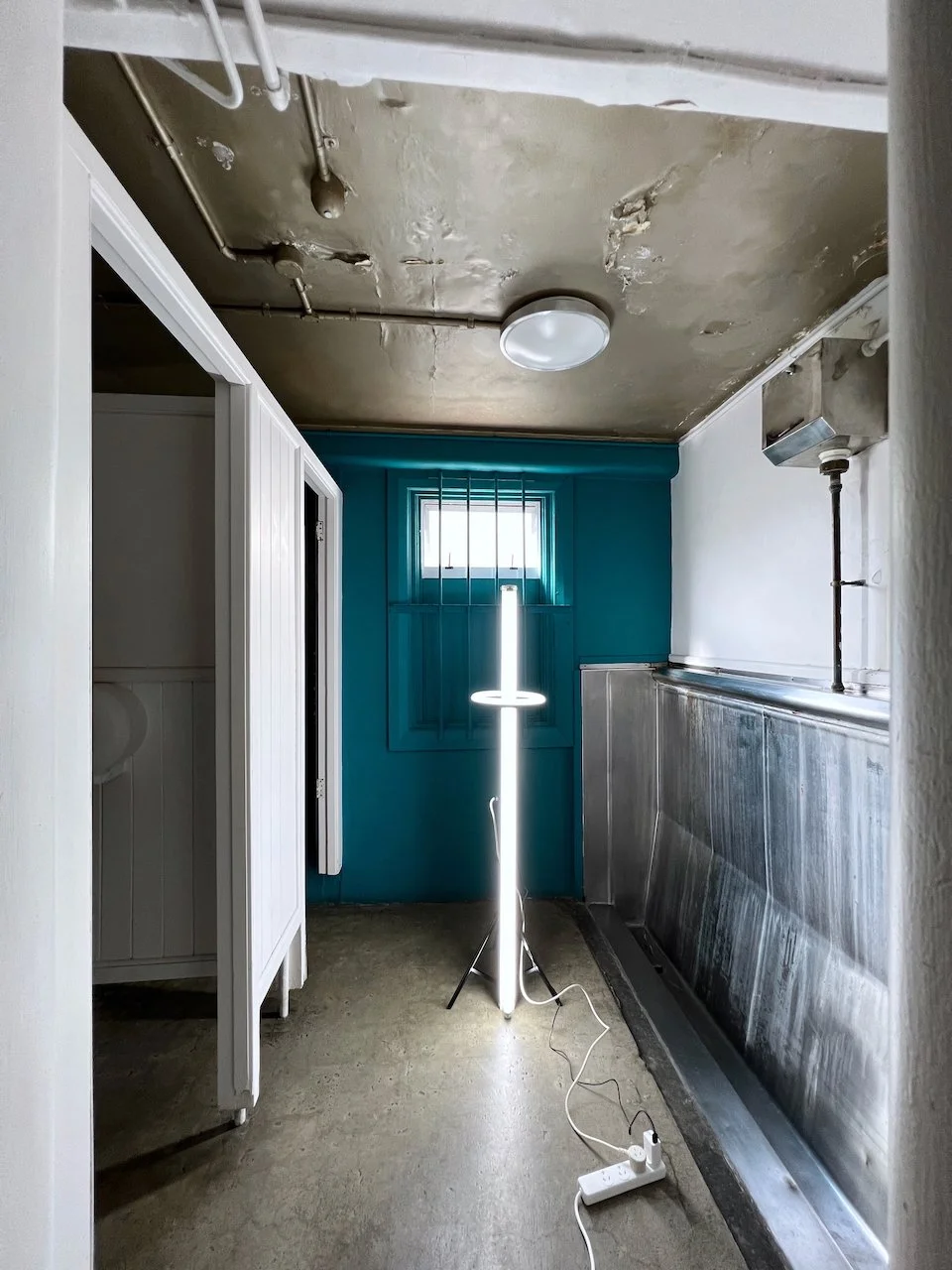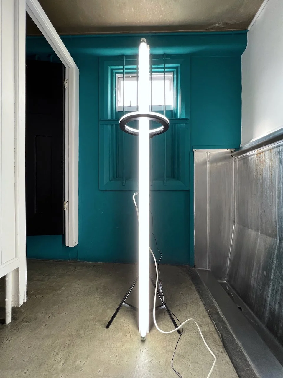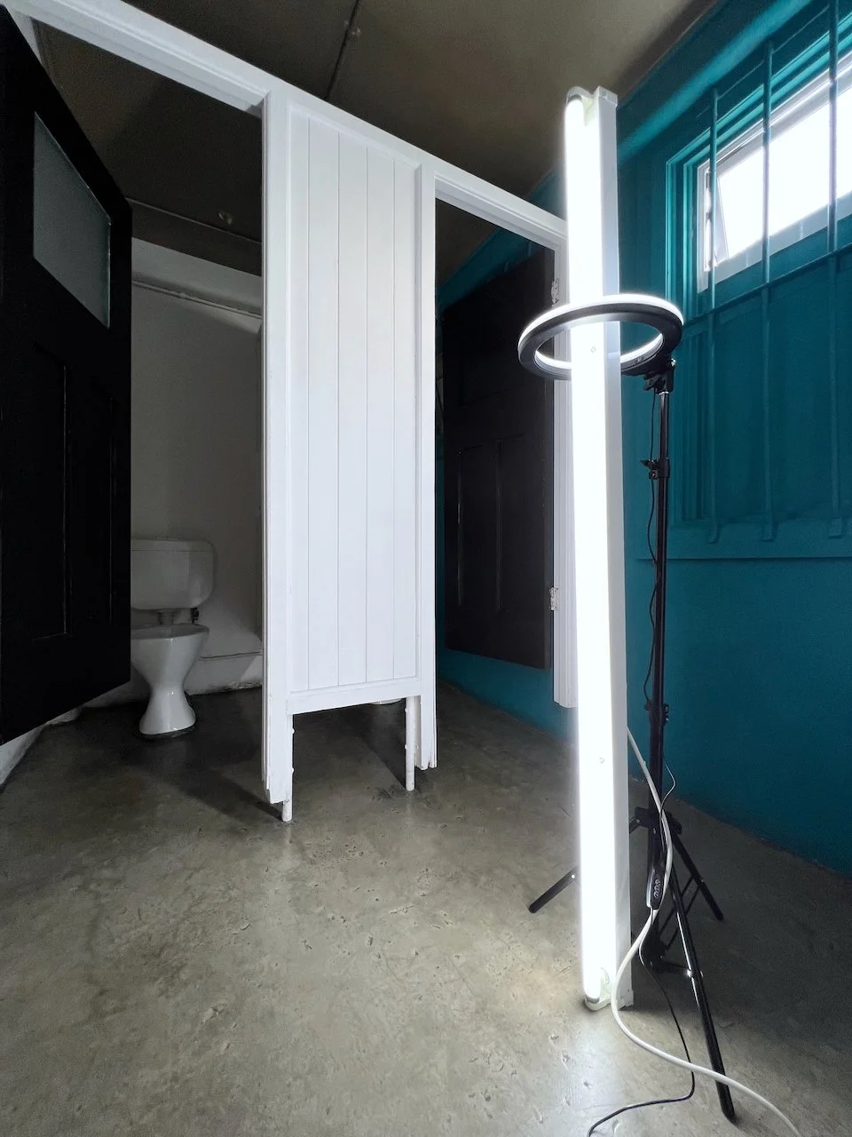 This work explores physical and digital dimensions of queer hook up realms in Taranaki. The work is sited in the men’s restroom in the theatre as a reflection on Novak’s past experience in a public restroom. The fluorescent light stands upright, passing through a LED ring light symbolising sexual intercourse. This extends beyond gay sex to sex in queer communities in general. The contrast and intermingling between physical and digital hook up realms is represented by the fluorescent light (older technology) and LED ring light (newer web related technology).