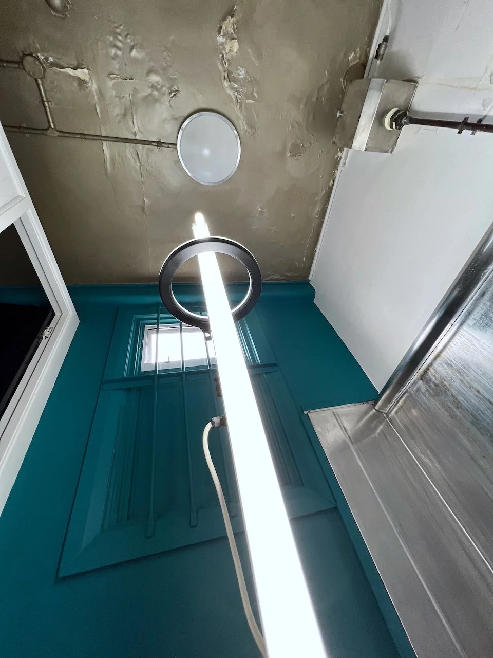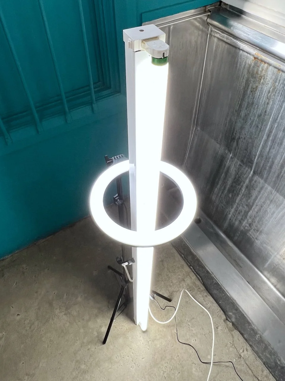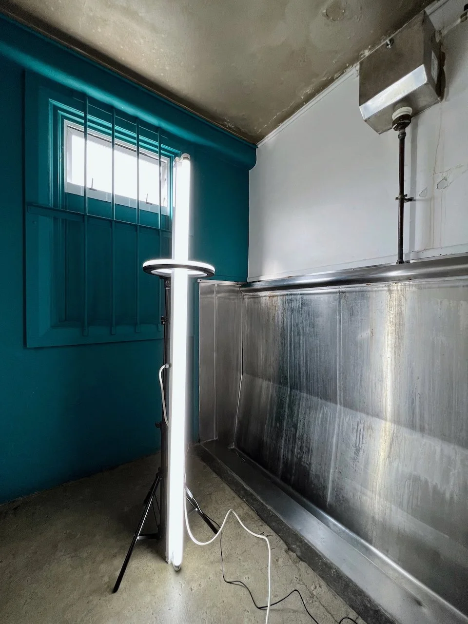 This work explores physical and digital dimensions of queer hook up realms in Taranaki. The work is sited in the men’s restroom in the theatre as a reflection on Novak’s past experience in a public restroom. The fluorescent light stands upright, passing through a LED ring light symbolising sexual intercourse. This extends beyond gay sex to sex in queer communities in general. The contrast and intermingling between physical and digital hook up realms is represented by the fluorescent light (older technology) and LED ring light (newer web related technology).