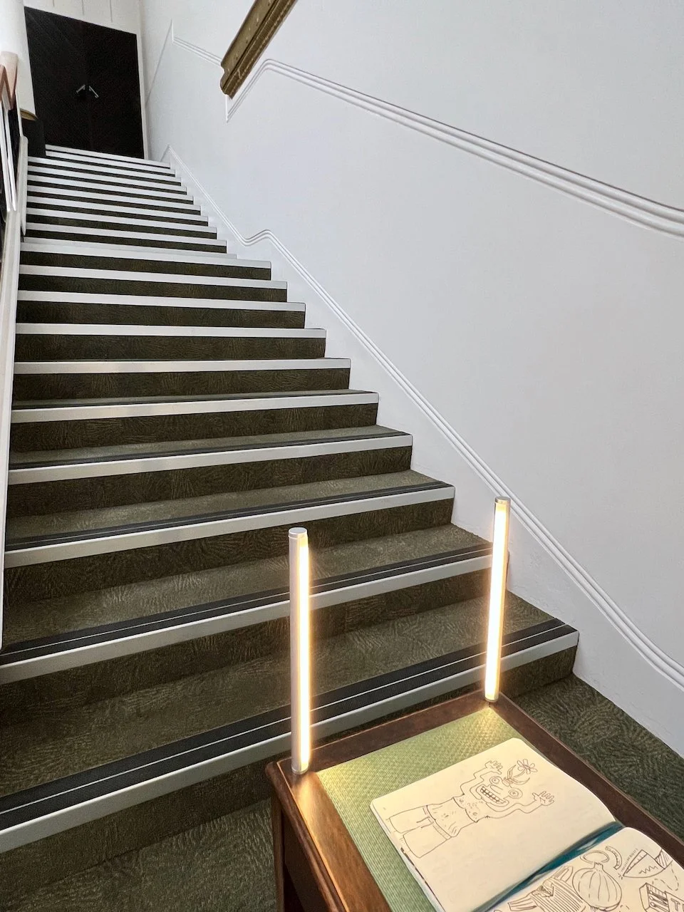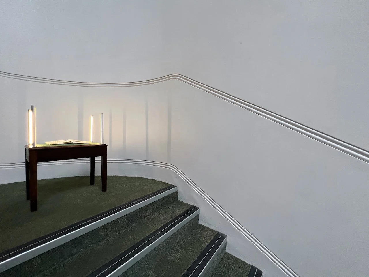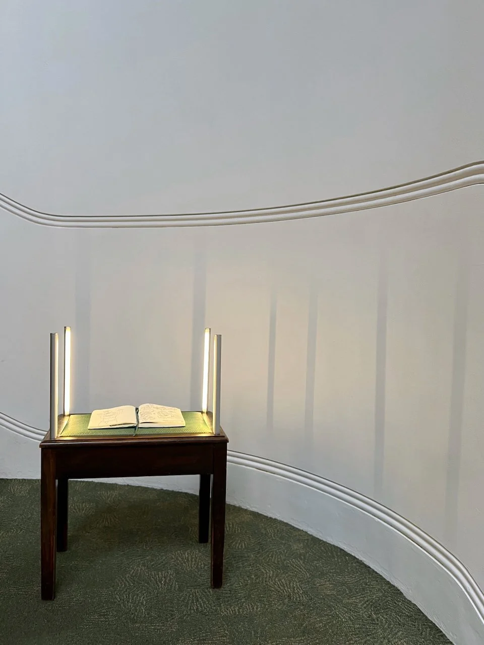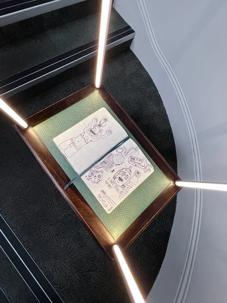 This is a collaborative work between Shannon Novak and local Wesley Milne exploring trans experiences in Taranaki. Milne lives in Taranaki and identifies as trans and queer. They also work in The Mayfair with queer youth. The work is sited on a stairway in the main theatre foyer that leads to the upper balconies (otherwise known as “the gods” or “paradise” in theatre). Milne’s personal journal sits on a piano stool, lit by four LED lights. The journal is open showing Milne’s self-portrait on the left, and a snapshot of their day on the right. The stairway represents a lifetime, Milne’s journal positioned at a relatively early point on the path with a set of closed doors at the top.