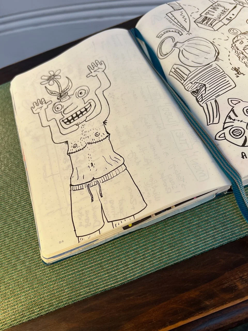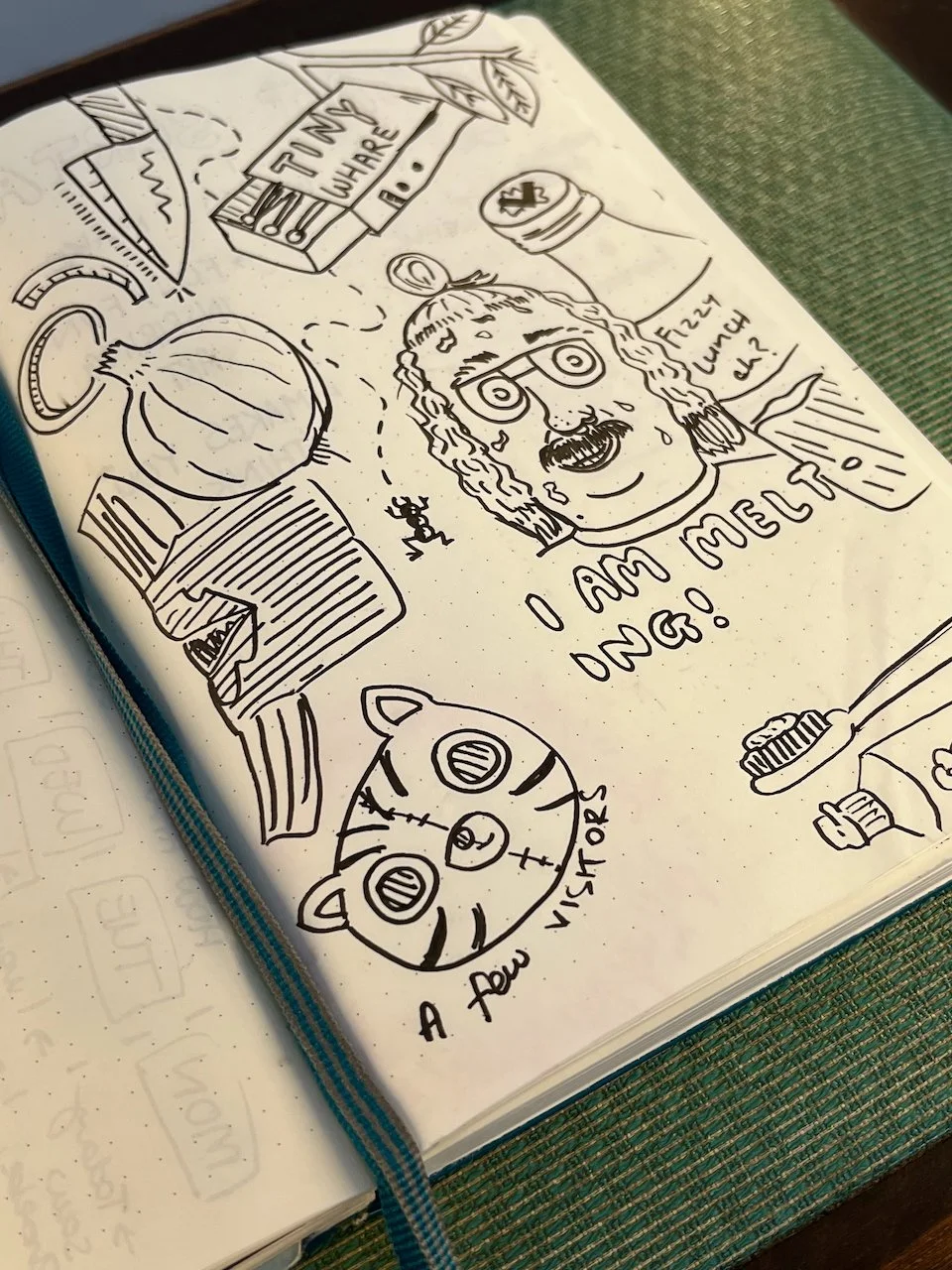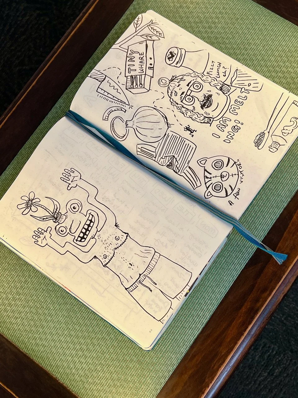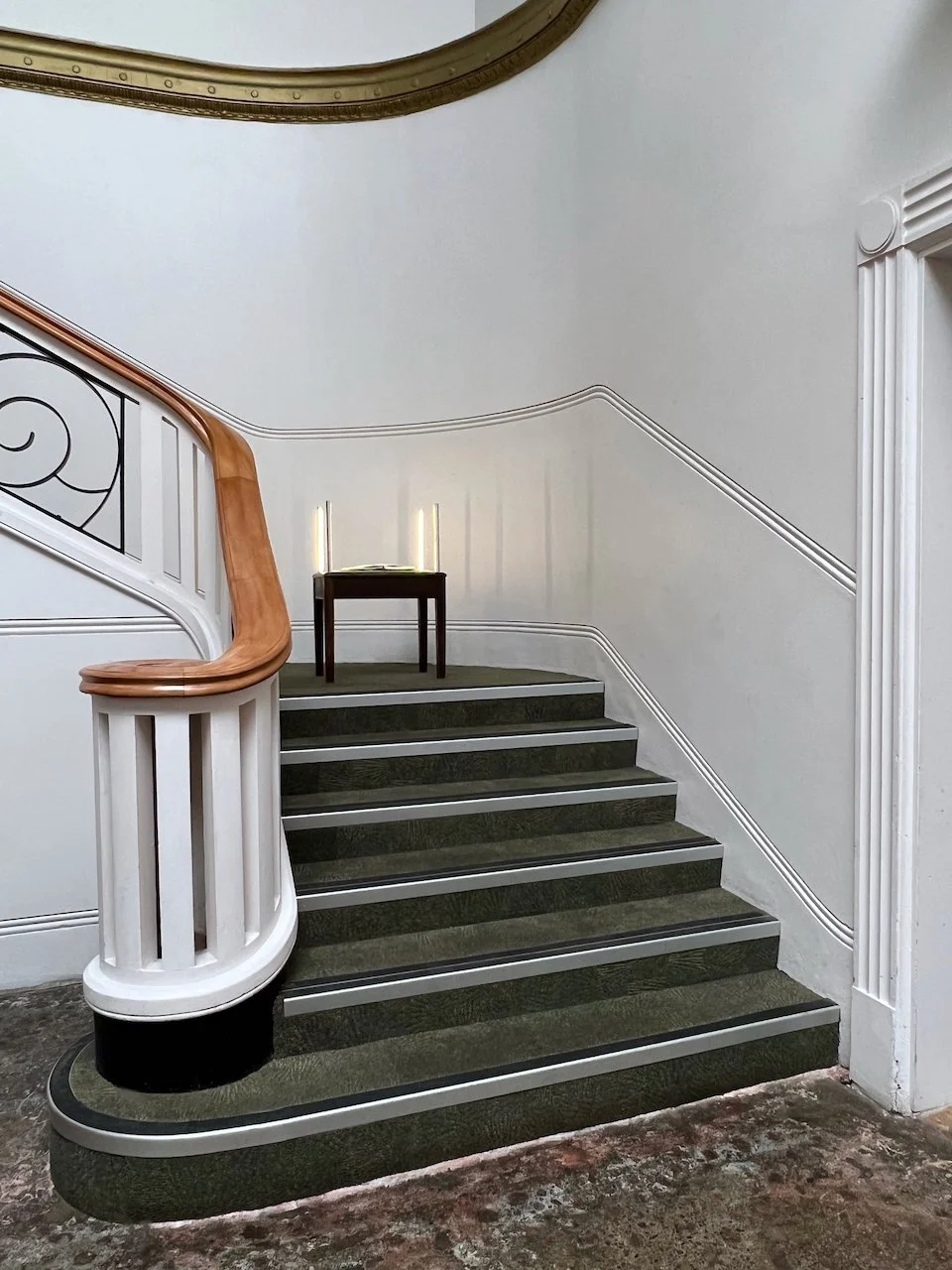 This is a collaborative work between Shannon Novak and local Wesley Milne exploring trans experiences in Taranaki. Milne lives in Taranaki and identifies as trans and queer. They also work in The Mayfair with queer youth. The work is sited on a stairway in the main theatre foyer that leads to the upper balconies (otherwise known as “the gods” or “paradise” in theatre). Milne’s personal journal sits on a piano stool, lit by four LED lights. The journal is open showing Milne’s self-portrait on the left, and a snapshot of their day on the right. The stairway represents a lifetime, Milne’s journal positioned at a relatively early point on the path with a set of closed doors at the top.