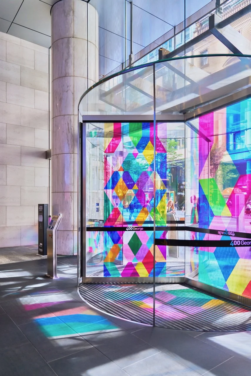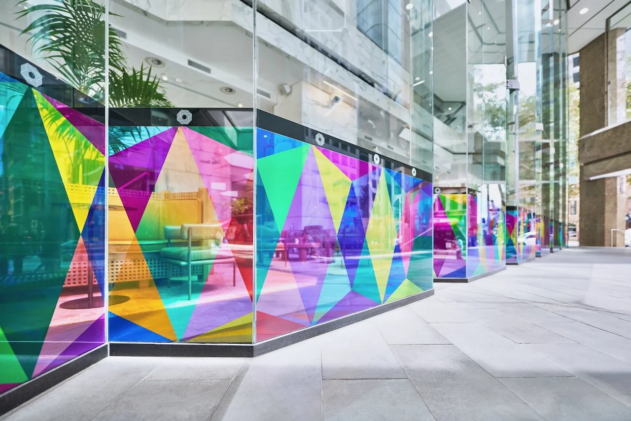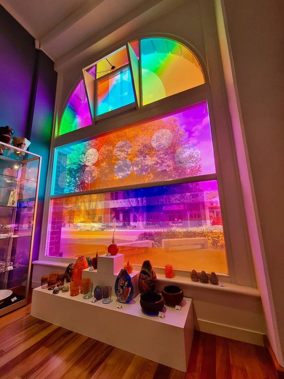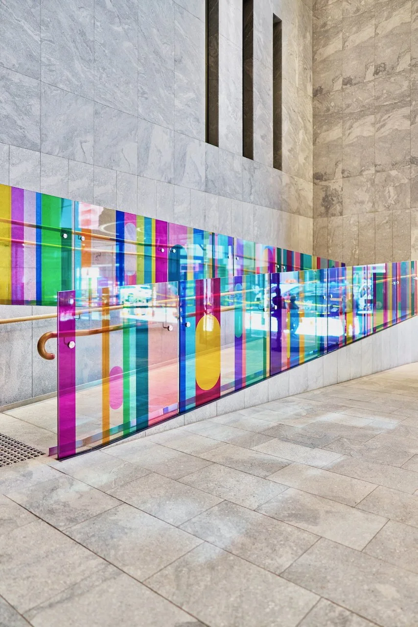 Refractions are glass based installations Novak began in 2011. Each refraction explores interactions between light, shape, and surface with a view to queering space. The name originates from Larry Bell’s Fractions, small works Bell began in 1996 that assemble elements of discarded works into new forms.