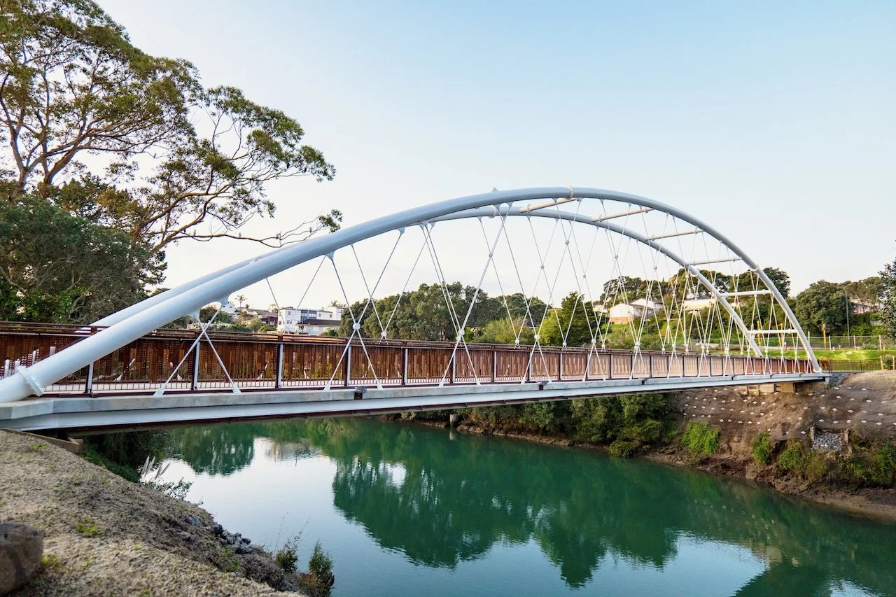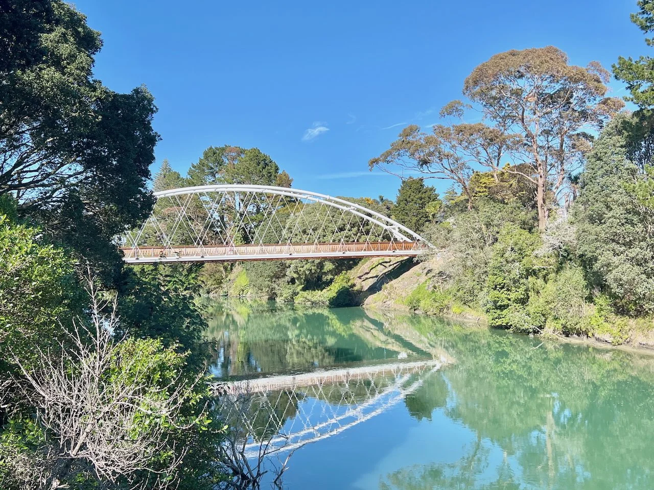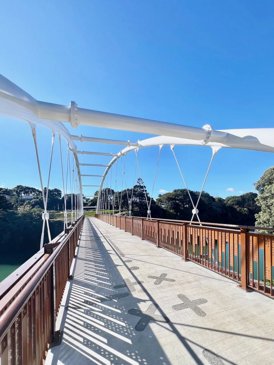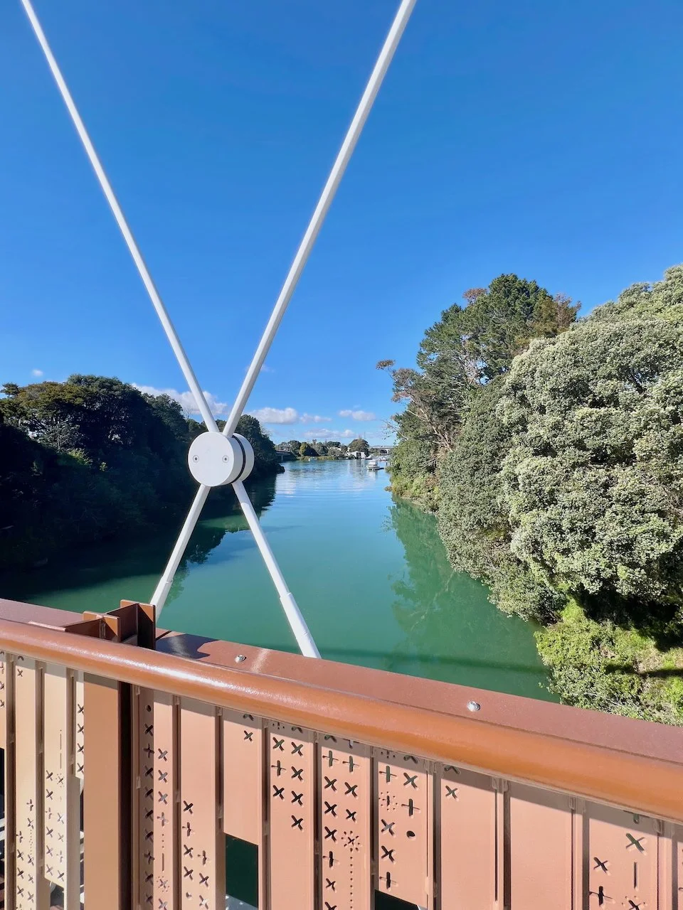 Te Kōpua o Hiku is a collaborative public artwork between Shannon Novak (Tarara) and Janine Williams (Ngāti Pāoa, Ngāti Whātua ki Kaipara, Ngāti Mahuta), commissioned by Auckland Council. The artwork takes the form of a bridge connecting two sides of the lagoon in Panmure Basin. Gifted by Ngāti Paoa, the bridge’s name is Te Kōpua o Hiku. The story behind the name is shared by Drina Paratene: “Te Kōpua o Hiku means The Deep Pool of Hiku, referring to the deep pool beneath the bridge. The pool was once occupied by Moko-ika-hiku-waru, the lizard-fish with eight tails who is the kaitiaki taniwha of the people of Ngāti Pāoa”.